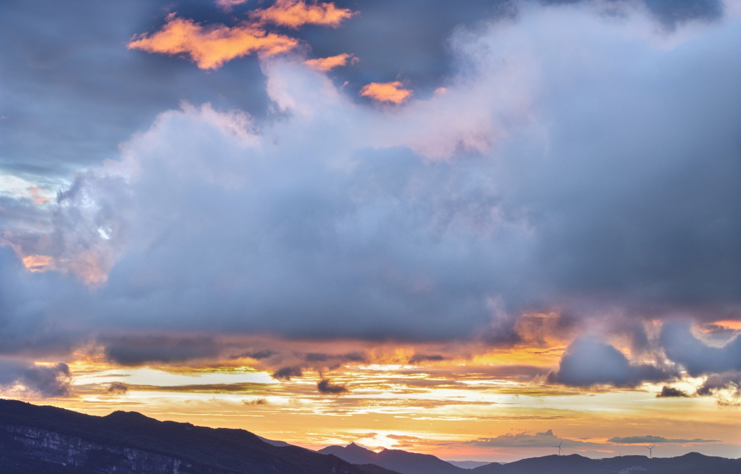 作品说明:太阳己隐藏在山下,其光线反射在远处的雲层形成桔黄色霞光,而近处的雲雾则挡住部分霞光,形成层次分明的风景,令人赏心悦目。本片拍摄于重庆市武隆县境内。