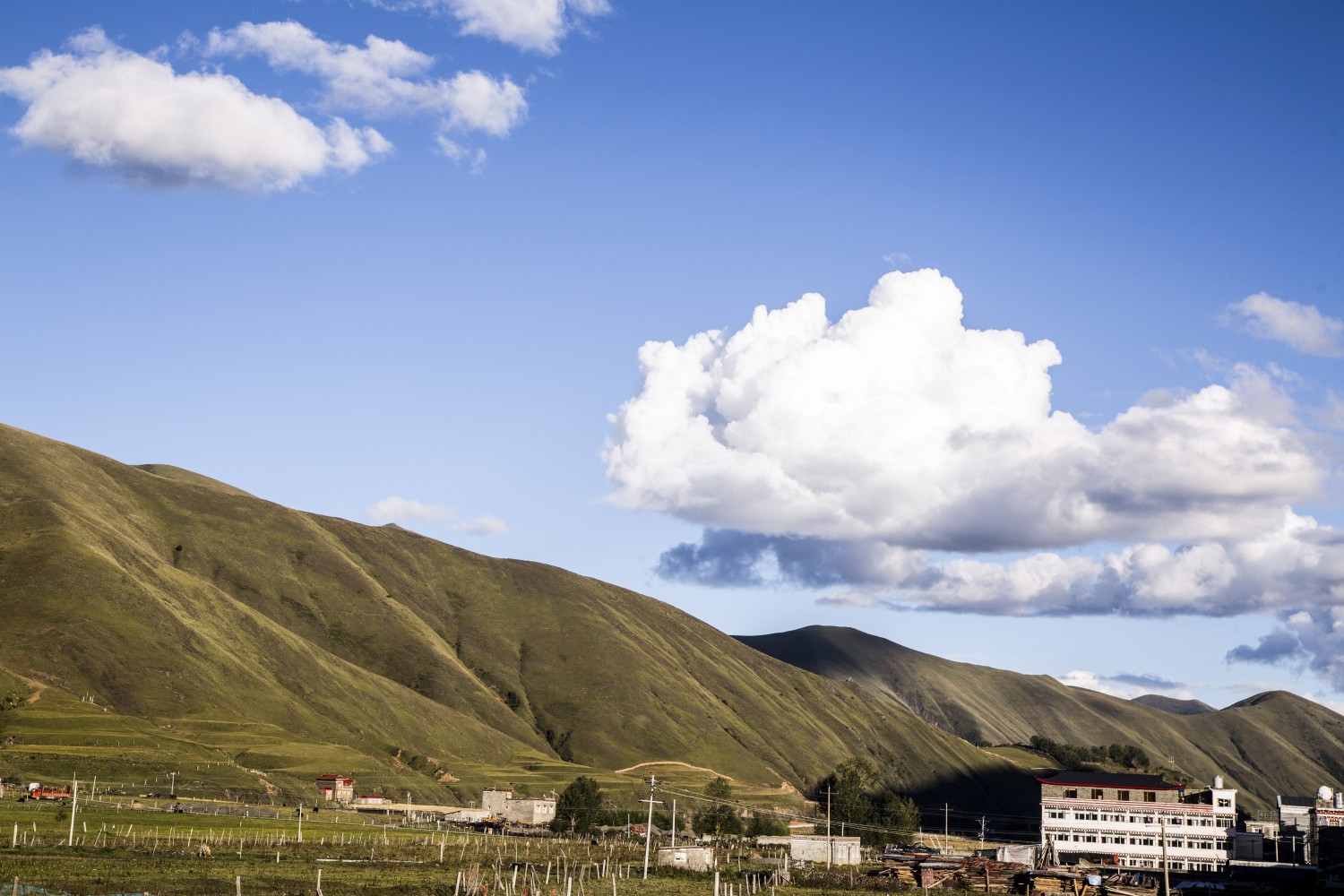 作品说明:呈现出蓝天、白云与翠绿山峦相映,山脚下村落错落的画面,尽显乡村自然与人文交融的清新美好。