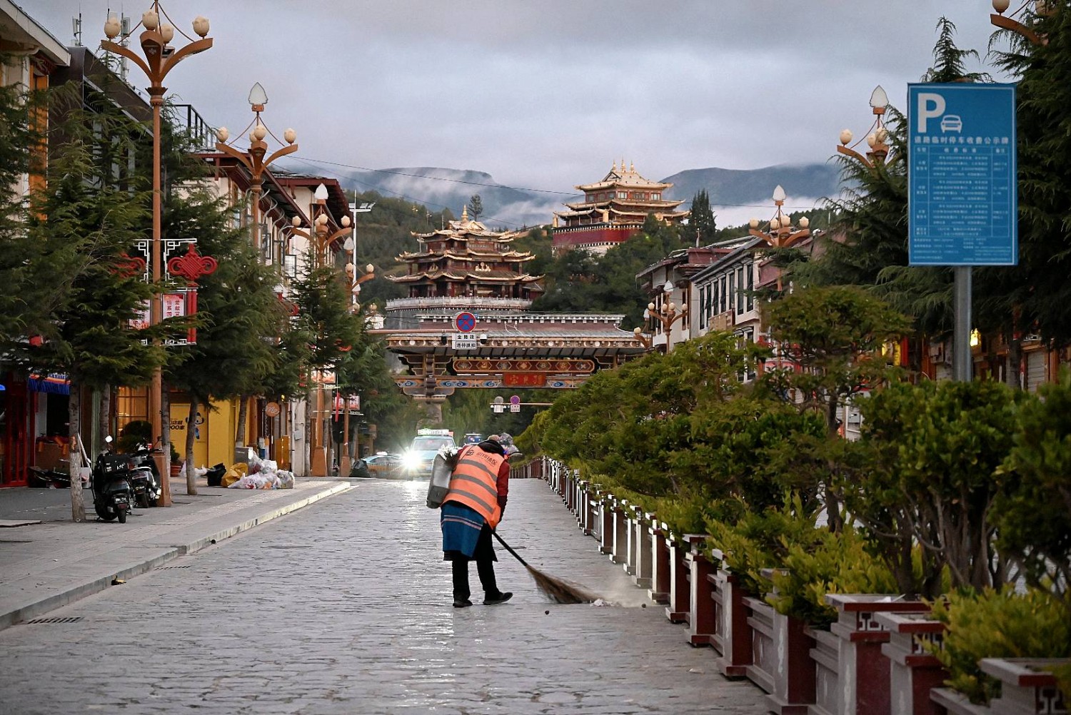 作品说明:独克宗古城的清晨,一位清洁工阿姨正在给街道做“美容”