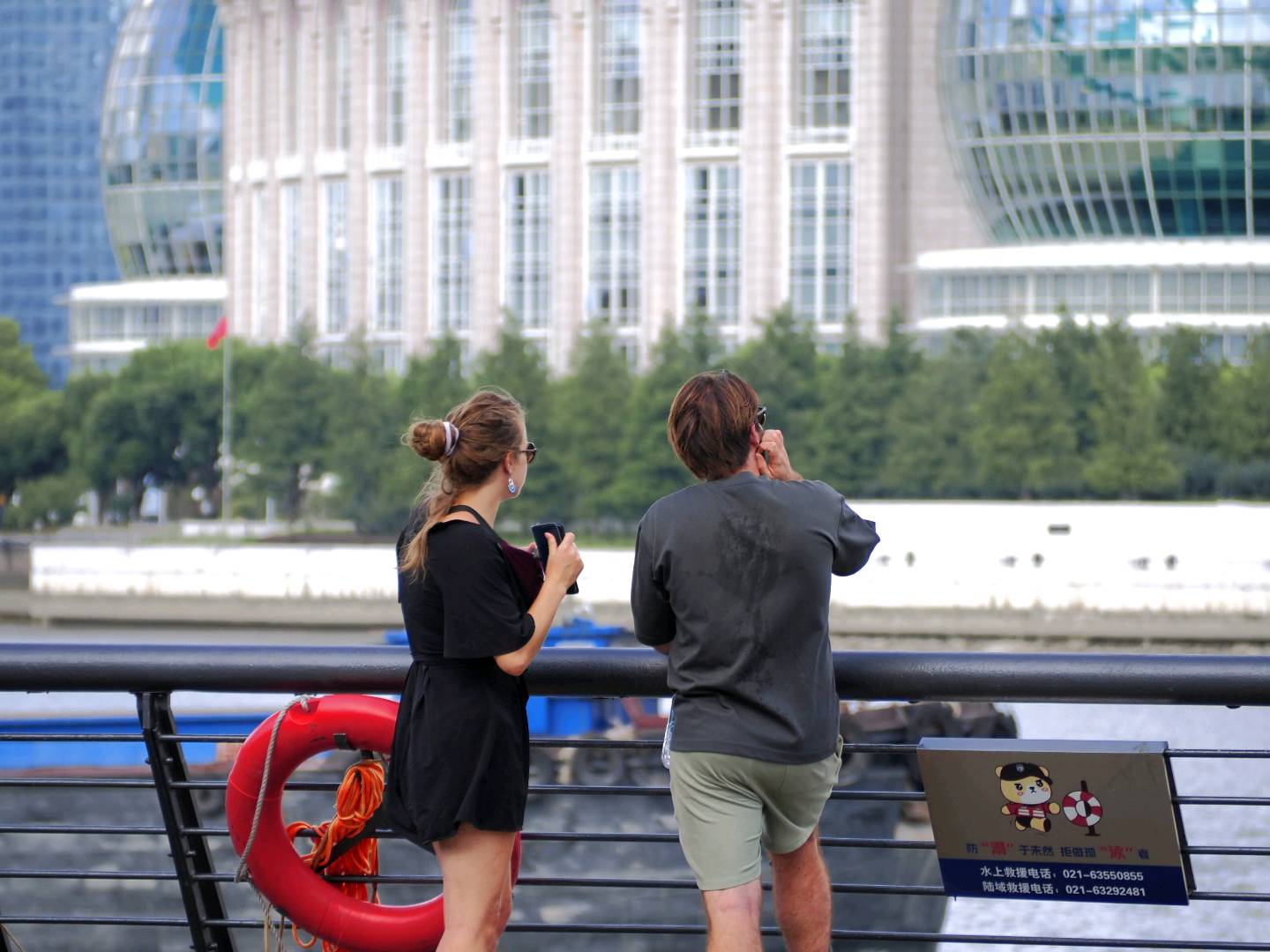 作品说明:图中上海外滩的日常一幕:两位国际友人凭栏远眺,背景是现代建筑群与绿树相映的天际线。近处的救生圈与指示牌细节,勾勒出公共空间的实用与温情。平凡视角下,人与城市景观自然交融,定格了都市生活中宁静而真实的瞬间,传递出日常场景中的平和与惬意。