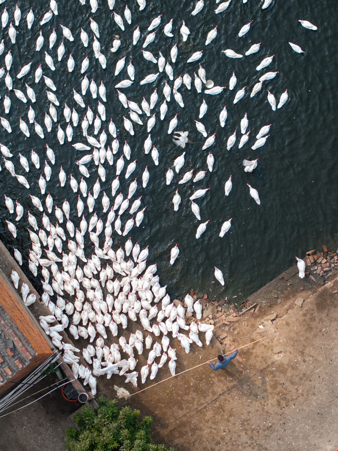 作品说明:从高空俯瞰,这位驯鸭人宛如指挥千军万马的将军。成百上千只白鸭,在他的指引下,或有序入水,或整齐列队,浩浩荡荡,蔚为壮观。他手持长竿,似将军的令箭,每一个动作都传递着指令,白鸭们则像训练有素的士兵,精准响应。在这片水域旁的天地里,他以独特的“兵法”,驾驭着这灵动的“鸭军”,演绎着一场别样的“战役”,展现出人与动物间默契协作的美妙画卷。