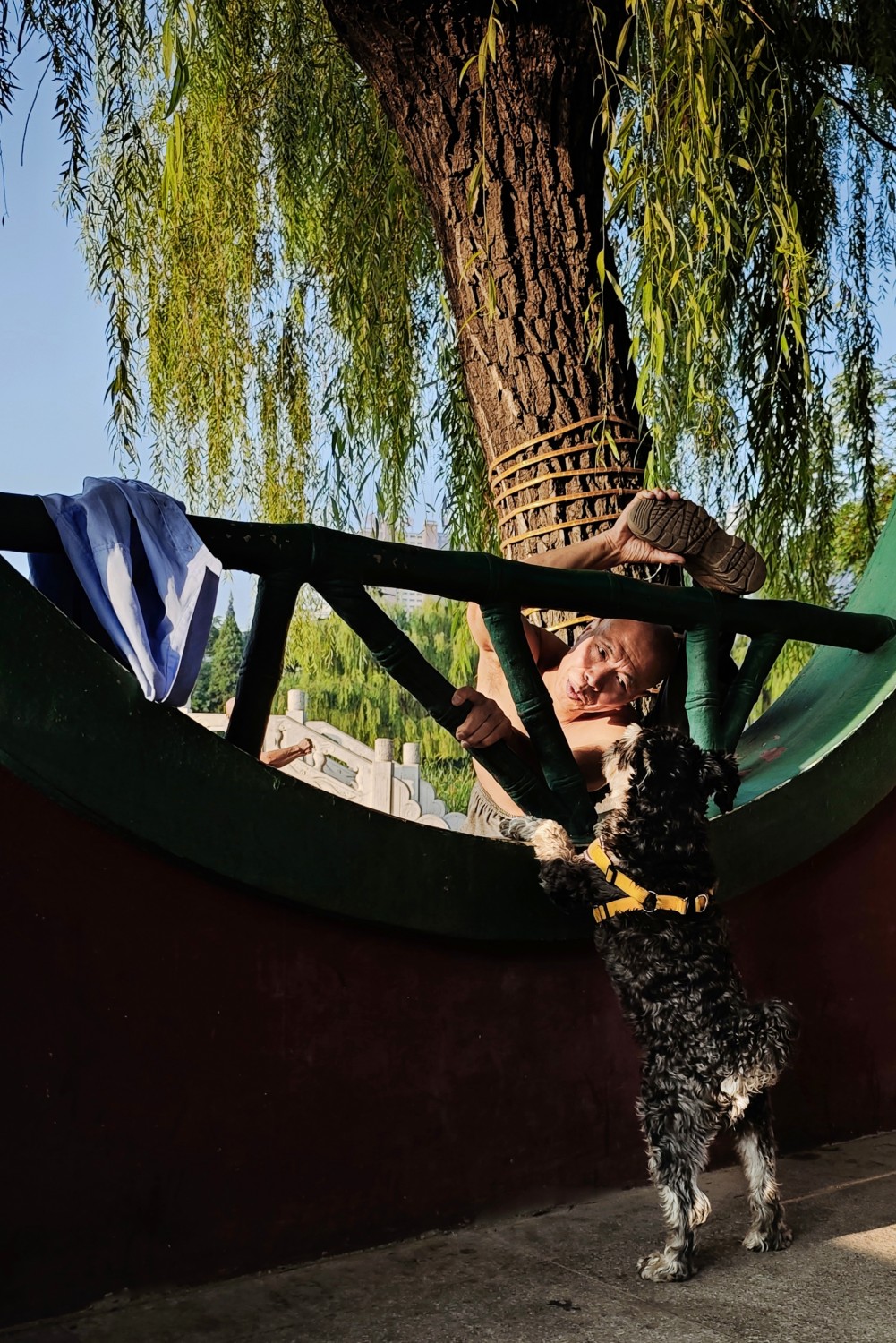 作品说明:公园里主人在练功他的狗狗在陪他一起练。