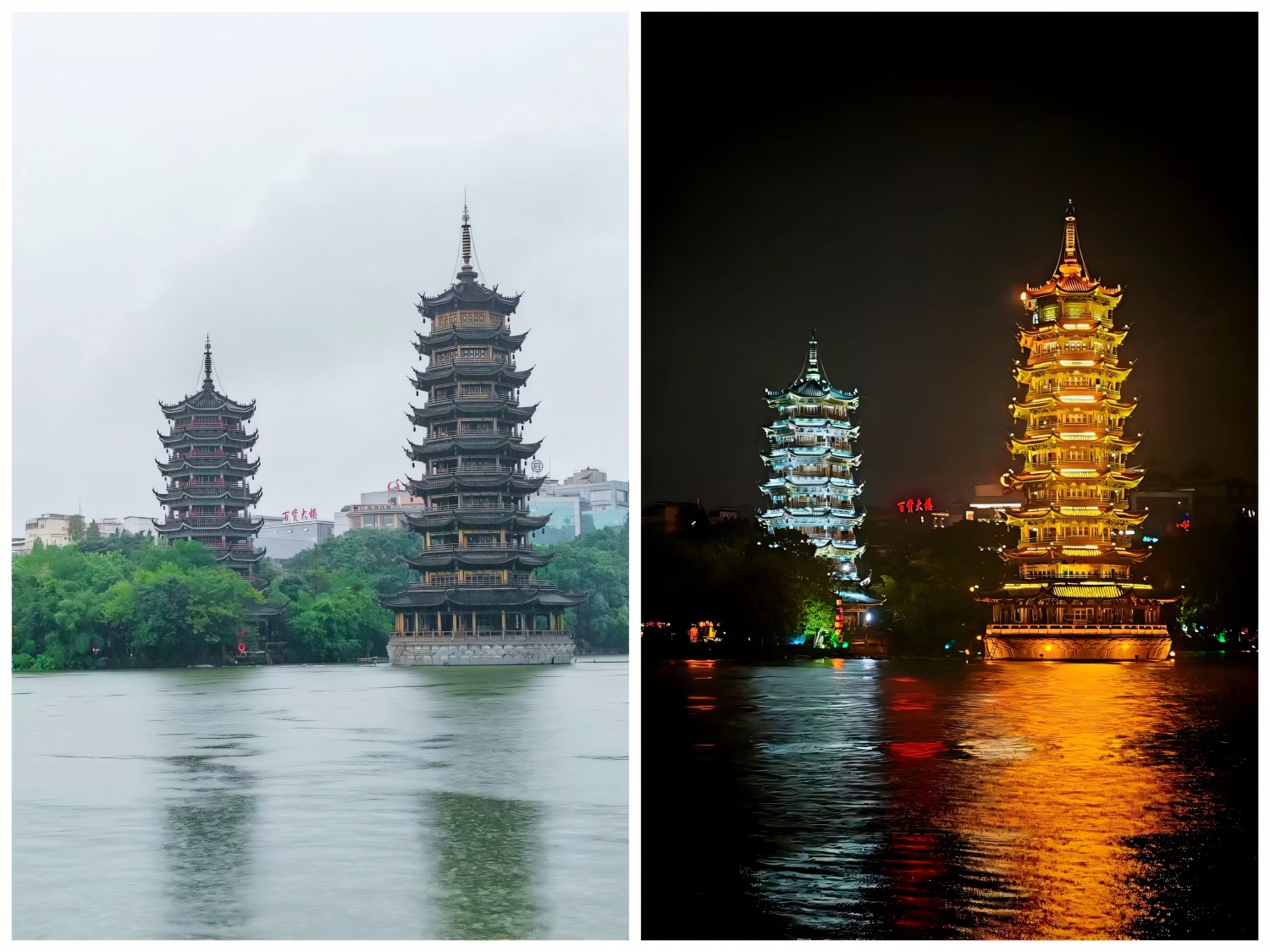 作品说明:桂林日月双塔中,日塔高41米为纯铜铸就,金碧辉煌象征光明;月塔高35米以琉璃为体,晶莹柔美寓意宁静。二者通过湖底隧道相连,夜现“金银双塔”倒影,共筑“日月同辉”奇观,尽显桂林山水与人文交融之美。