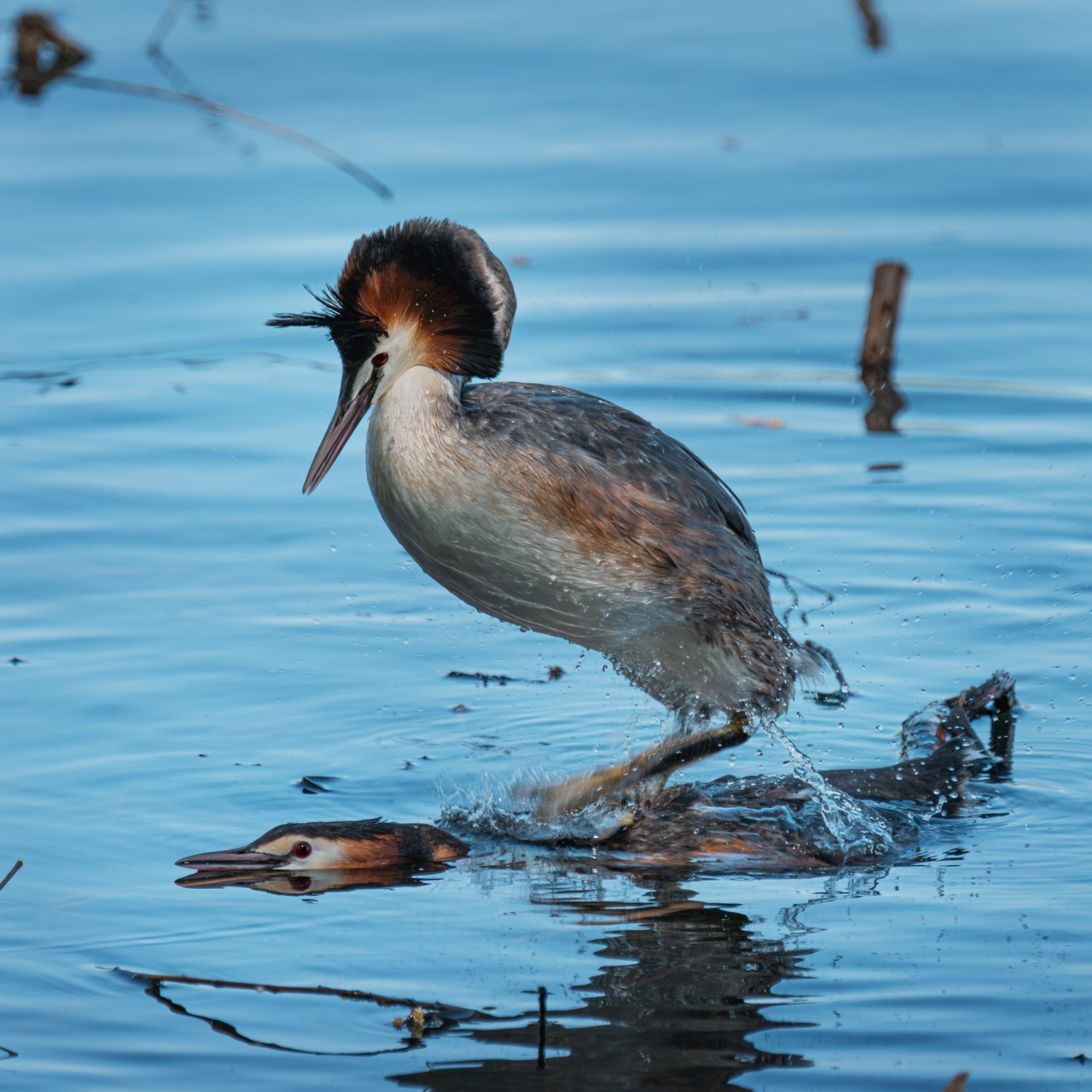 作品说明:澄澈如宝石的颐和园湖面上,两只凤头鸊鷉正演绎着属于它们的“爱情仪式”。头顶棕黑相间羽冠的个体昂首挺立于水面,修长尖喙与蓬松羽冠在阳光下熠熠生辉;水下同伴的身姿随涟漪起伏,溅起的水花为这场“圆舞曲”添上灵动韵律。
