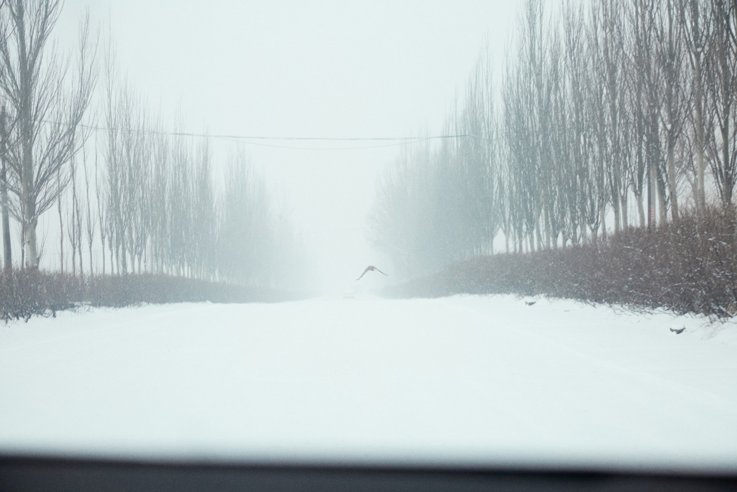 作品说明:与朋友驱车在雪天公路,山雀在车前与我们保持距离相伴飞行