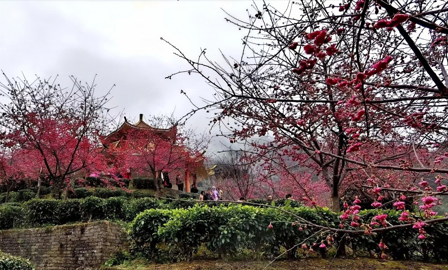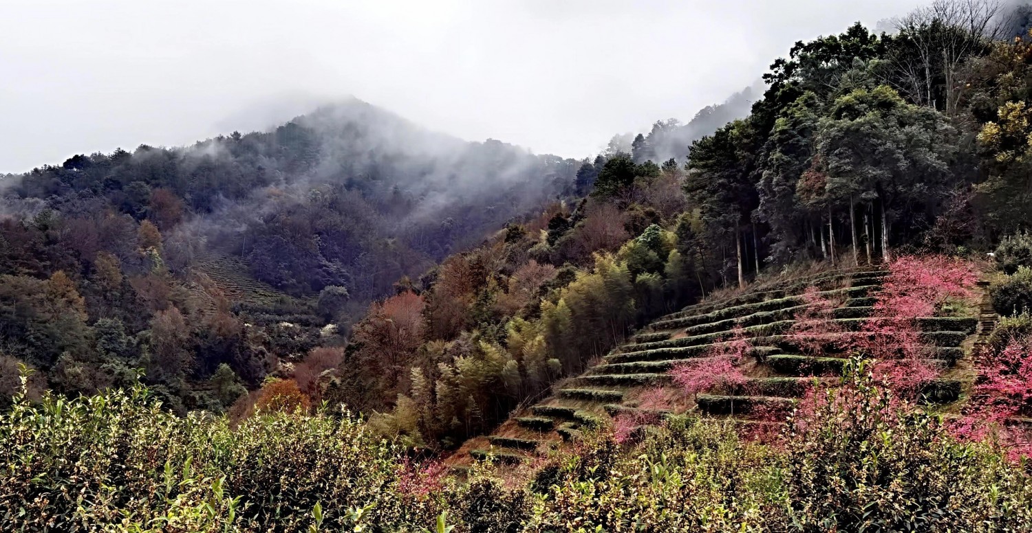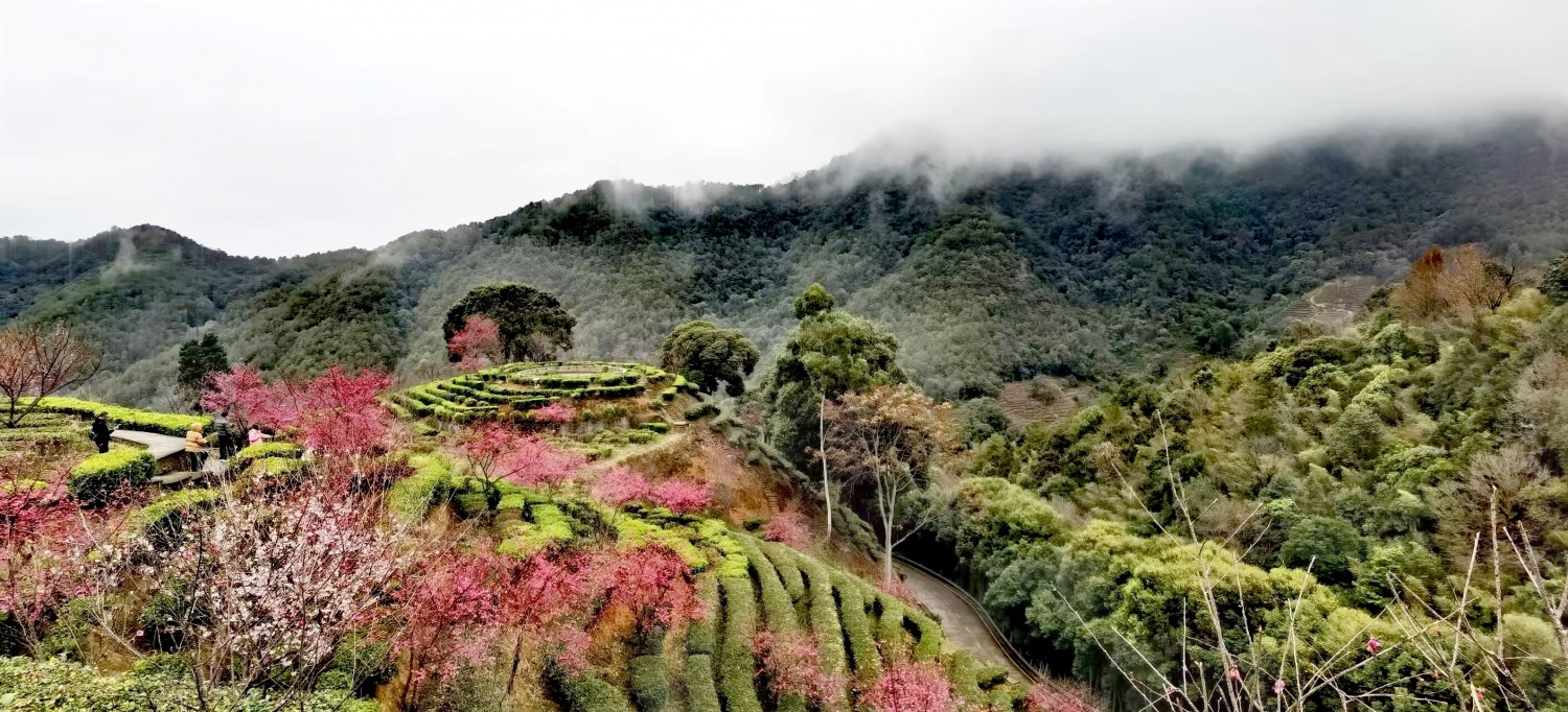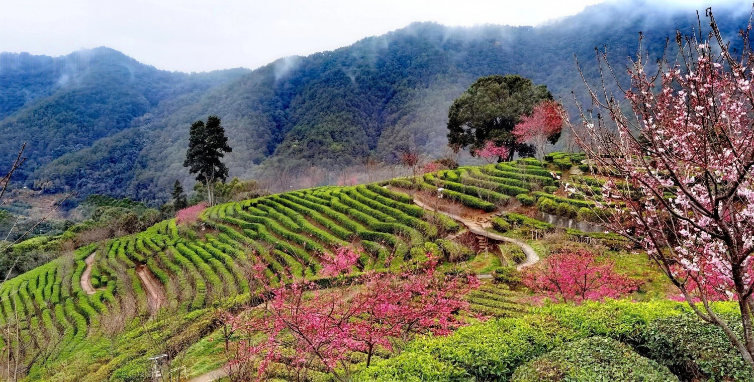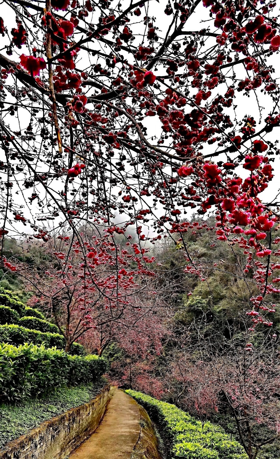 作品说明:茶山红妆组图共5幅照片。用华为P40p手机全自动全屏幅拍摄于广东梅州阴那山茶园。一片片绿油油的茶树间点缀着几株盛开的樱花,灿烂绚丽,与远处的青山遥相呼应,构成一幅幅光彩夺目的雅致画面。(照片对比度和篇幅有做后期简单调整)