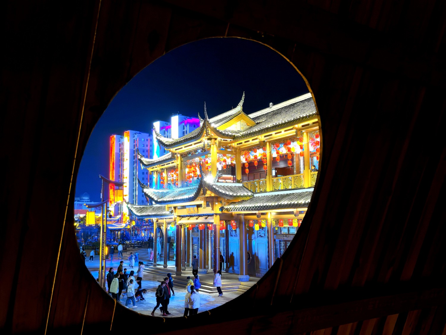 作品说明:福建省龙岩市连城县群众活动广场的传统建筑街区与当代高楼大厦相邻,夜景靓丽,居民游客川流不息,恍如穿行在古老与现实之间。
