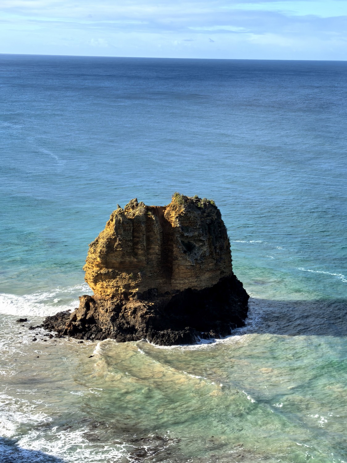 作品说明:这张照片捕捉了墨尔本大洋路令人惊叹的海景。画面中央,一块巨大的礁石傲然挺立,仿佛是大海的守护者,历经千万年海浪的雕琢,展现出坚韧与沧桑。周围是一望无际的碧蓝色海洋,海水清澈透亮,与蓝天相接,形成一幅纯净而壮阔的自然画卷。大洋路以其独特的海岸风光闻名于世,这张照片中的礁石正是大自然鬼斧神工的杰作,见证了岁月的变迁和大海的力量。