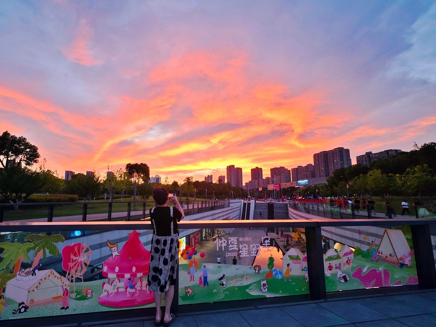 作品说明:摄自常州文化广场,彩霞满天与围栏上斑斓的装饰相互辉映。