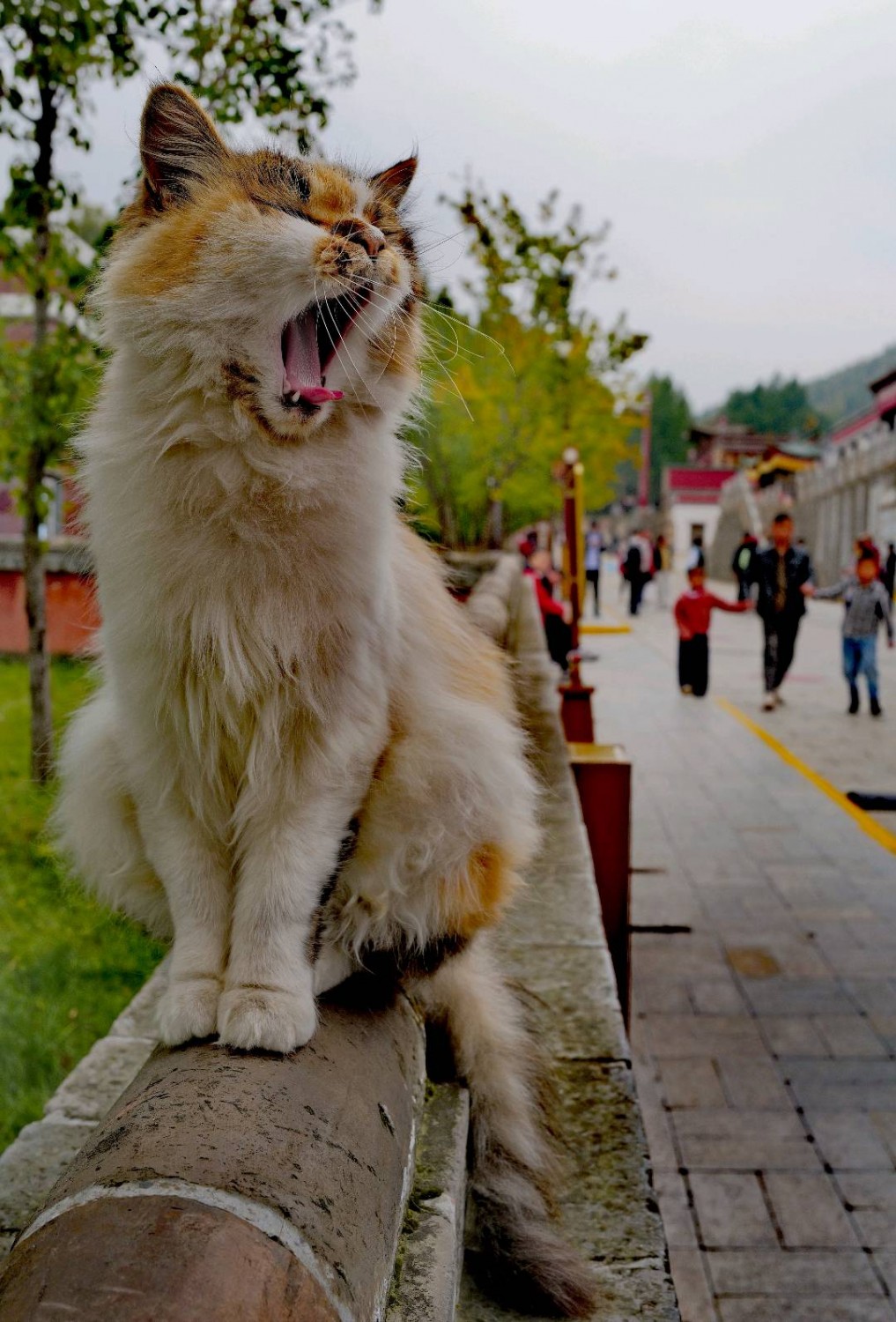 作品说明:青海塔尔寺的网红三花猫面对人来人往的游客,自顾自哈欠连天。