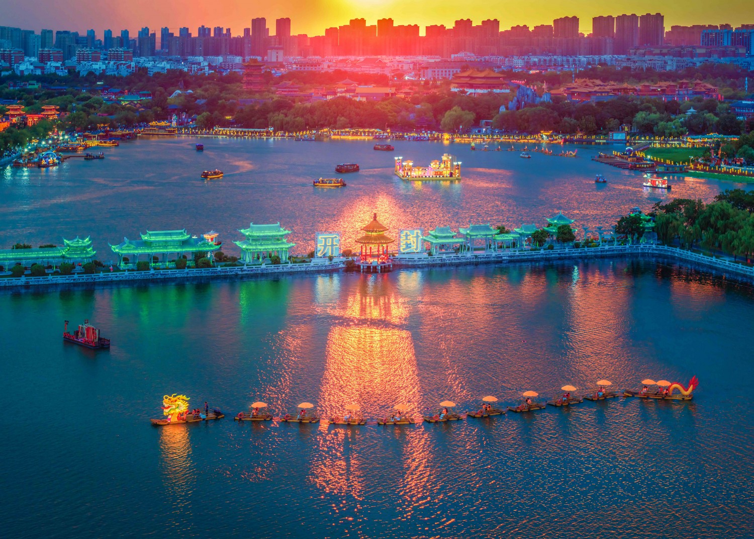作品说明:暮色中的开封龙亭湖,宛如一幅绚丽的画卷。夕阳为天际染上暖橙,城市楼宇在暮色里渐次朦胧。湖面上,游船闪烁着暖黄的光,还有造型别致的龙形船队,悠悠穿行。岸边古色古香的建筑被彩灯勾勒,“开封”字样熠熠生辉,光影在水波里摇曳,历史的厚重与夜色的璀璨交融,尽显这座古城的独特韵味。