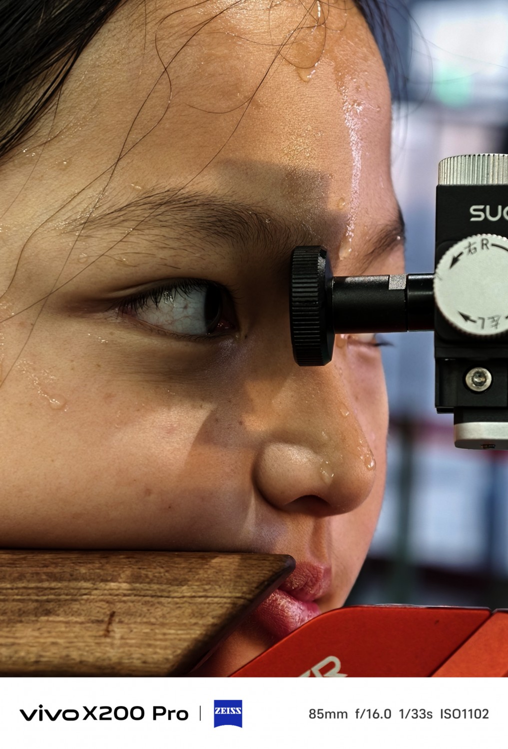 作品说明:这张照片聚焦于射击运动员眼部的局部特写。 眼眸清澈而专注,透过瞄准镜,仿佛与远处的 靶心建立起了无形的连接。运动员全神贯注、 屏气凝神的瞬间,展现出射击运动中那极致的 专注与沉稳,传递出一种静谧却又充满力量的 竞技氛围。
