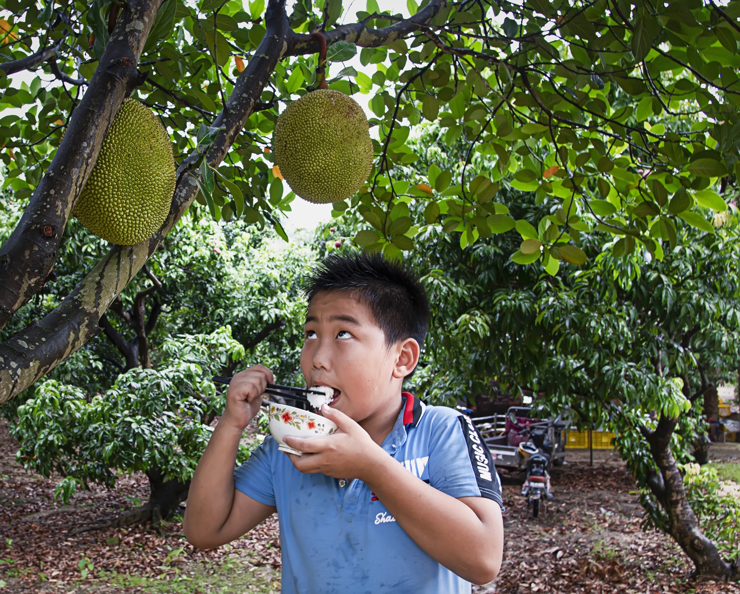 作品说明:果园里小男孩吃饭时被旁边树上的菠萝蜜吸引了。