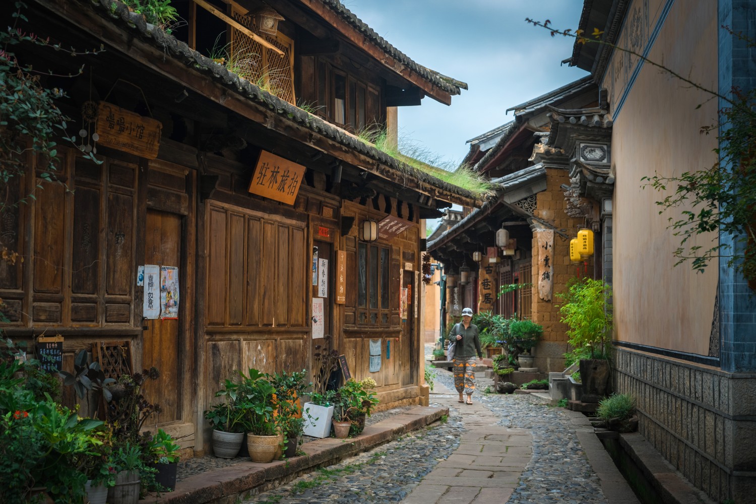 作品说明:一条古朴静谧的古镇小巷:两侧是木质老建筑,屋顶覆着青草,透着岁月沧桑;商铺招牌、中式灯笼点缀其间,流露烟火气;鹅卵石与石板铺就的路面旁,绿植盆栽生机盎然;行人悠然漫步,蓝天映衬下,尽显古镇慢生活的闲适与诗意。