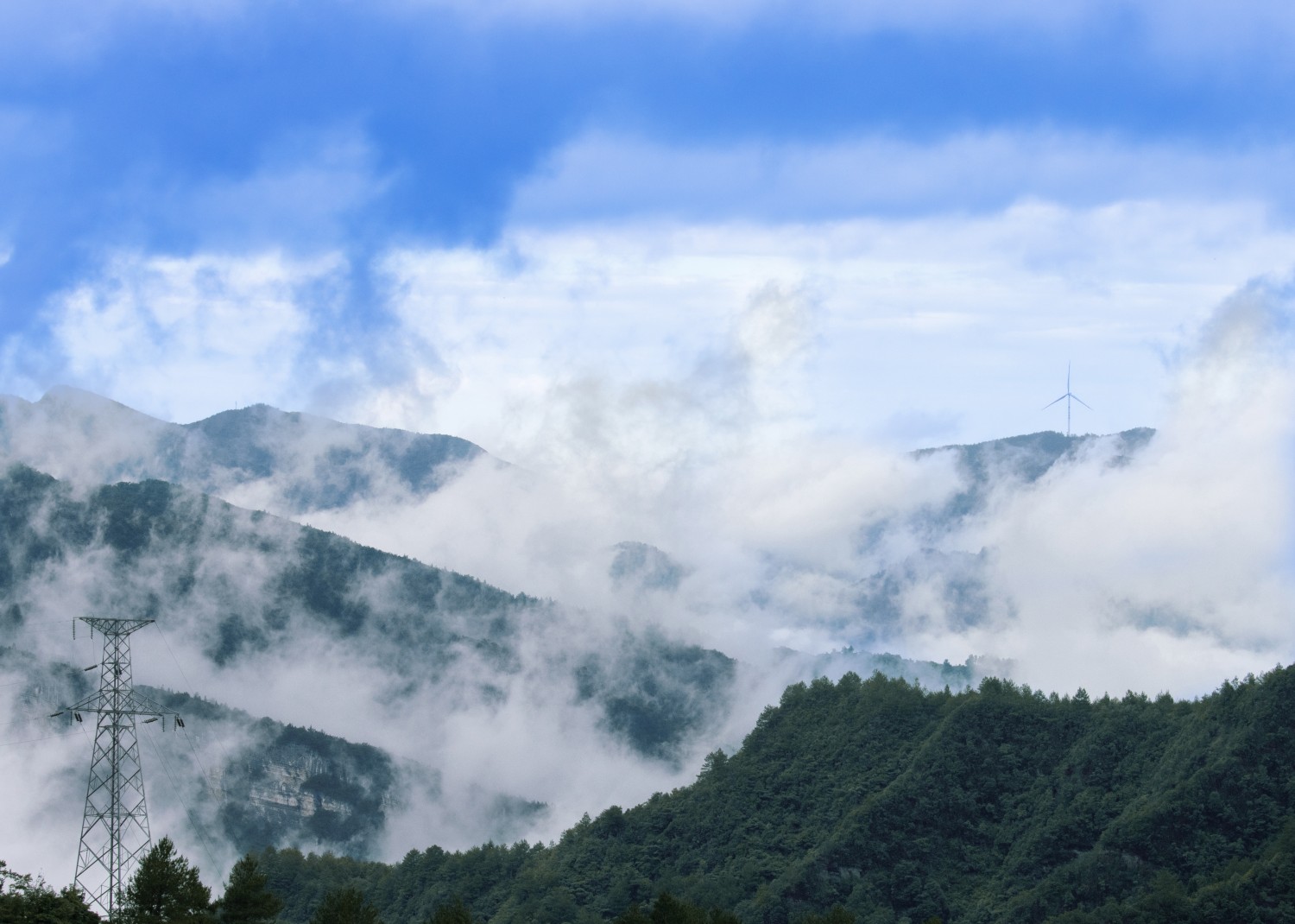 作品说明:远山的风力发电机与近处的输电塔遥相呼应,反映了风力发电的状态。本片拍摄于重庆市武隆县境内。