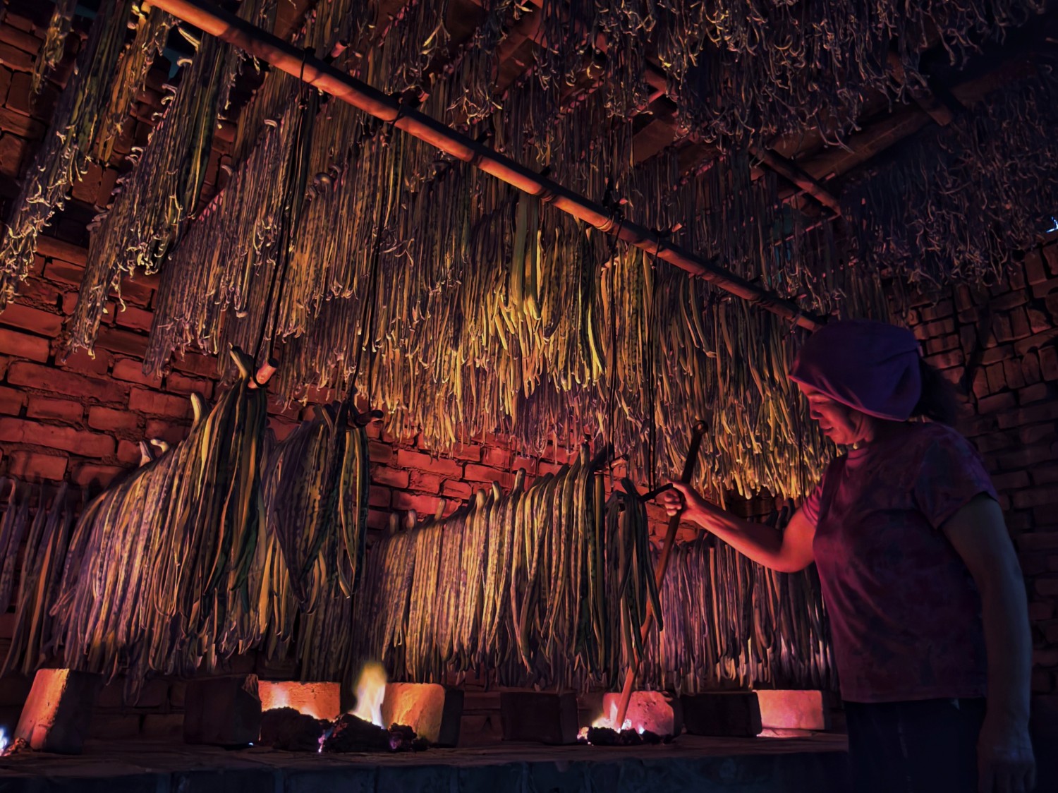 作品说明:夜晚的烤房在炉灶光线的渲染下,呈现出平定黄瓜干制作的神秘与传统。农妇的操作、满架制品,传递非遗工艺在特定时空里的坚守。展现出古老工艺在当代延续的温度 。