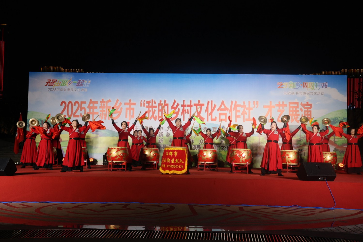 作品说明:“乡韵”凸显乡村文化韵味,“红鼓”呼应表演中民俗乐器的红火氛围,展现乡村文化合作社的民俗传承活力。