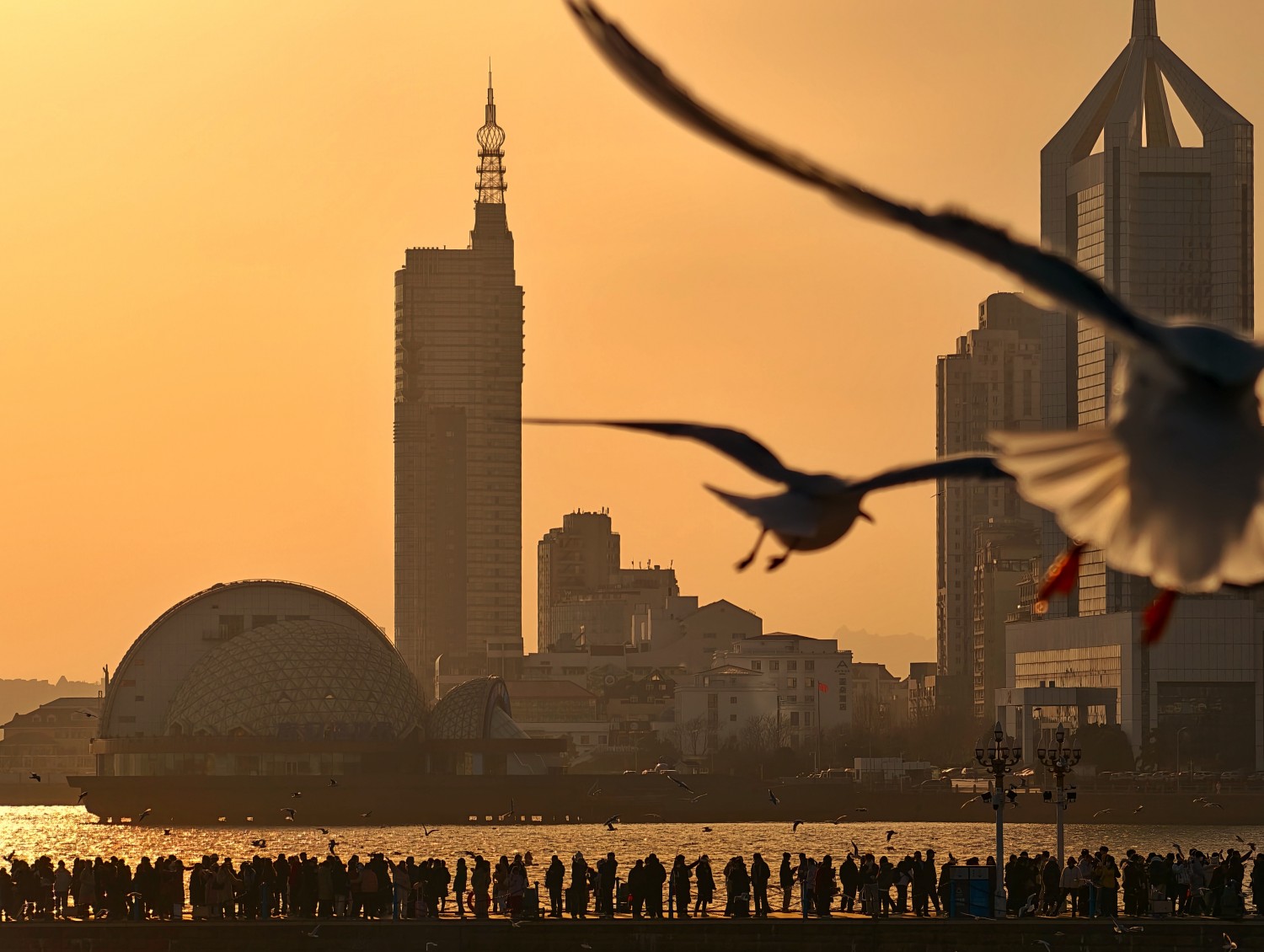 作品说明:夕阳映照下的青岛栈桥,人潮涌动,游客如织。