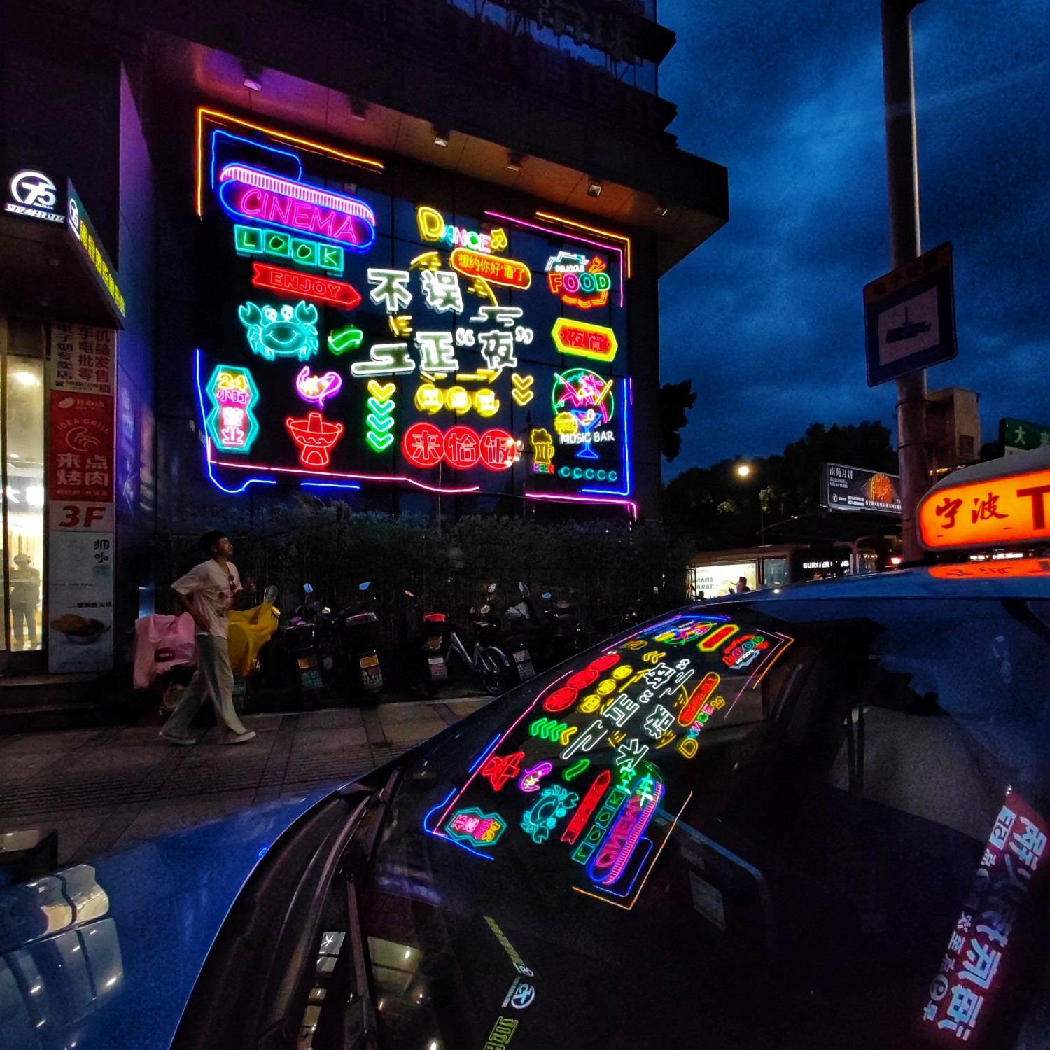 作品说明:汽车的挡风玻璃反光多彩的霓虹灯,使夜色更添色彩。摄自宁波街头。