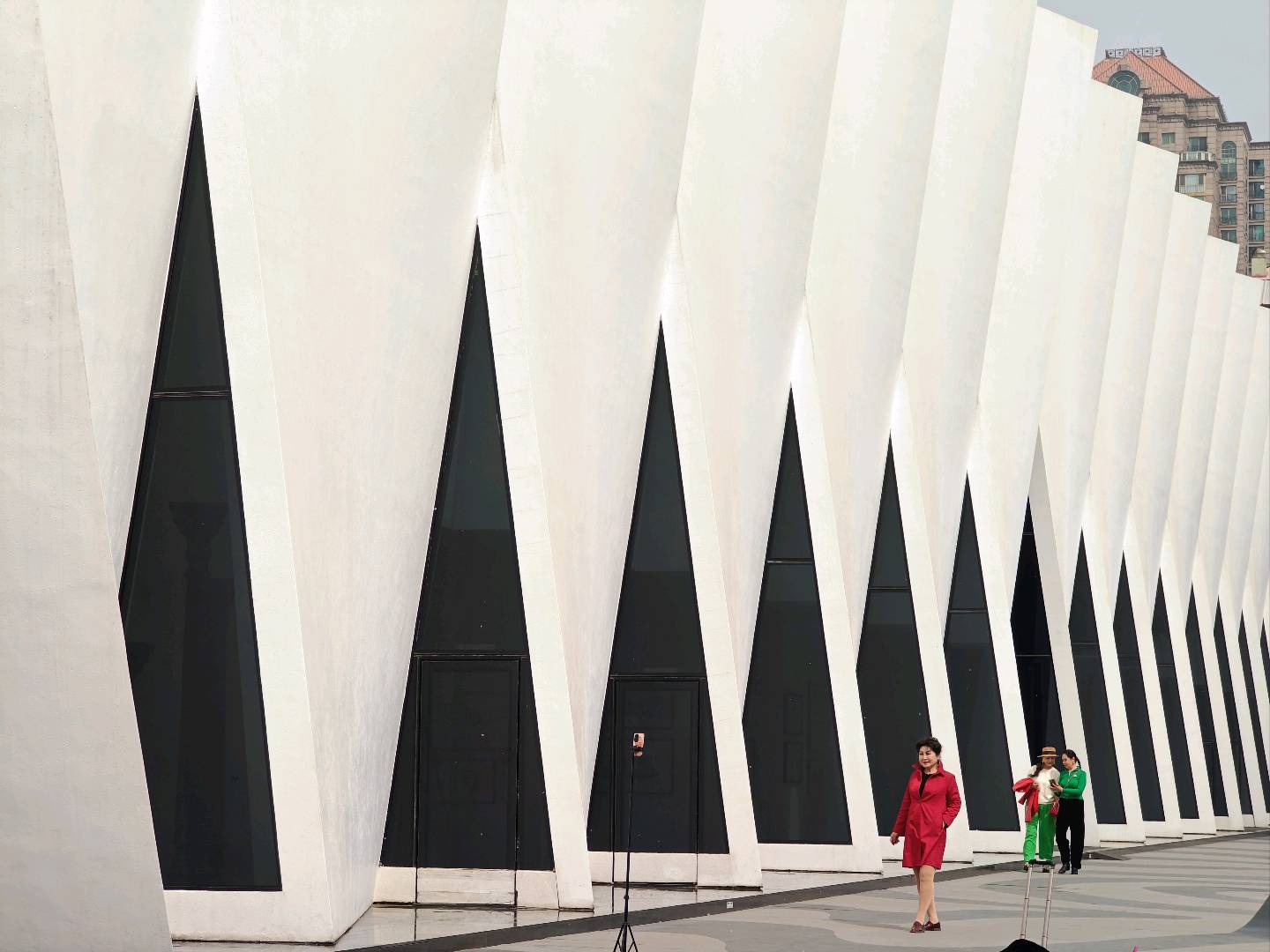 作品说明:在北京洞穴馆极具设计感的现代建筑外景前,一位女士正用三脚架认真定格画面,时而调试角度拍摄照片,时而切换模式录制视频,在独特的建筑美学与自然光影间,将此刻的惬意与美好,悄悄藏进生活的影像里。