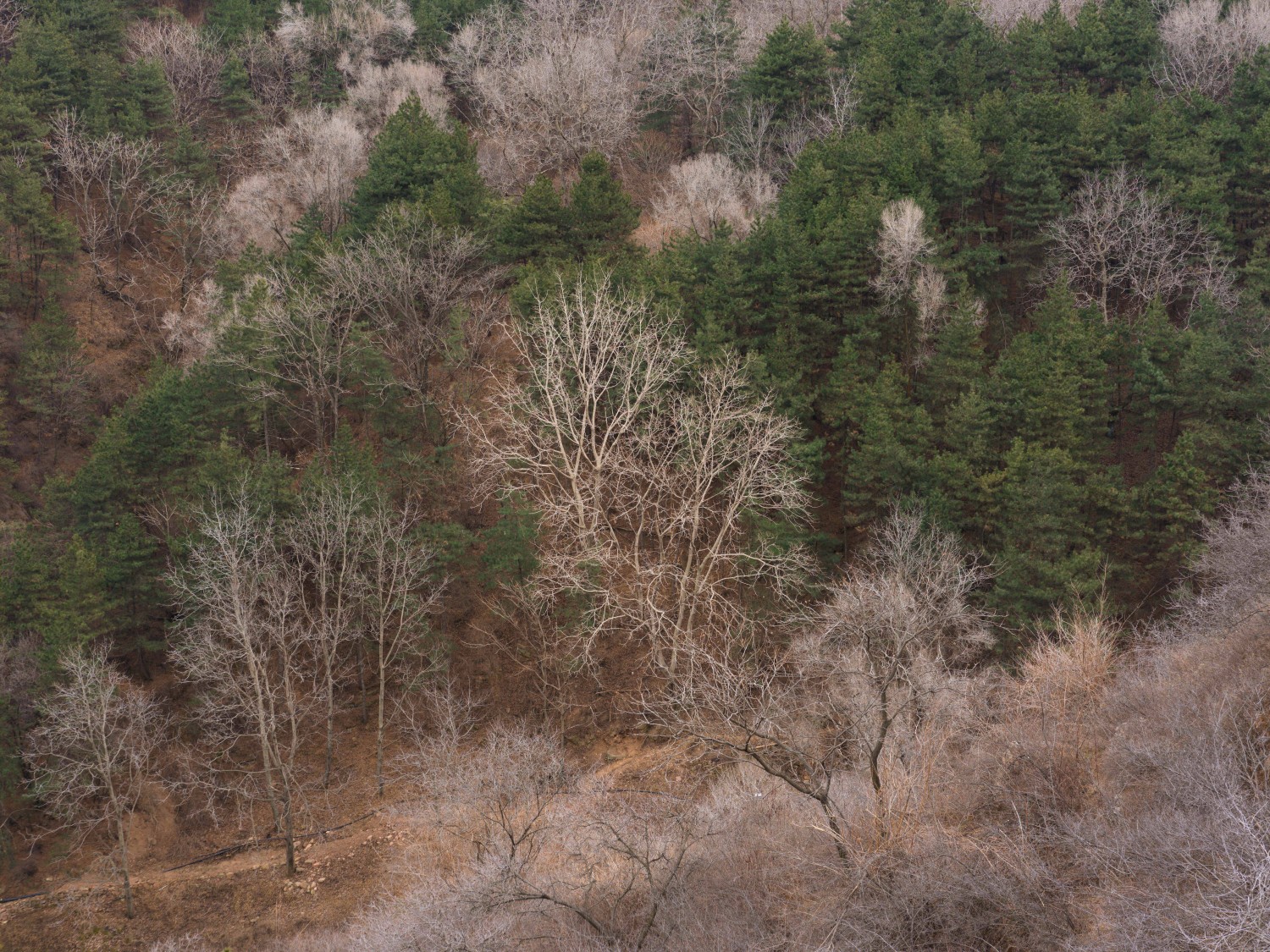 作品说明:树木的交替形态——常绿与落叶、繁茂与枯寂被并置为生命周期的隐喻。绿色与枯黄色的碰撞不仅指向季节性的表象,更揭示了万物的生长与衰败、持续与断裂、覆盖与暴露。镜头捕捉的并非单纯的森林景观,而是时间本身的物质化痕迹。