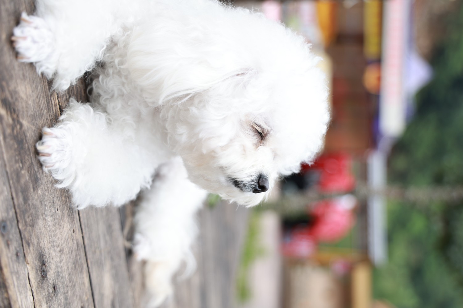 作品说明:将小白狗比作精灵,结合背景的绿意,体现它在林间木台休息的画面。