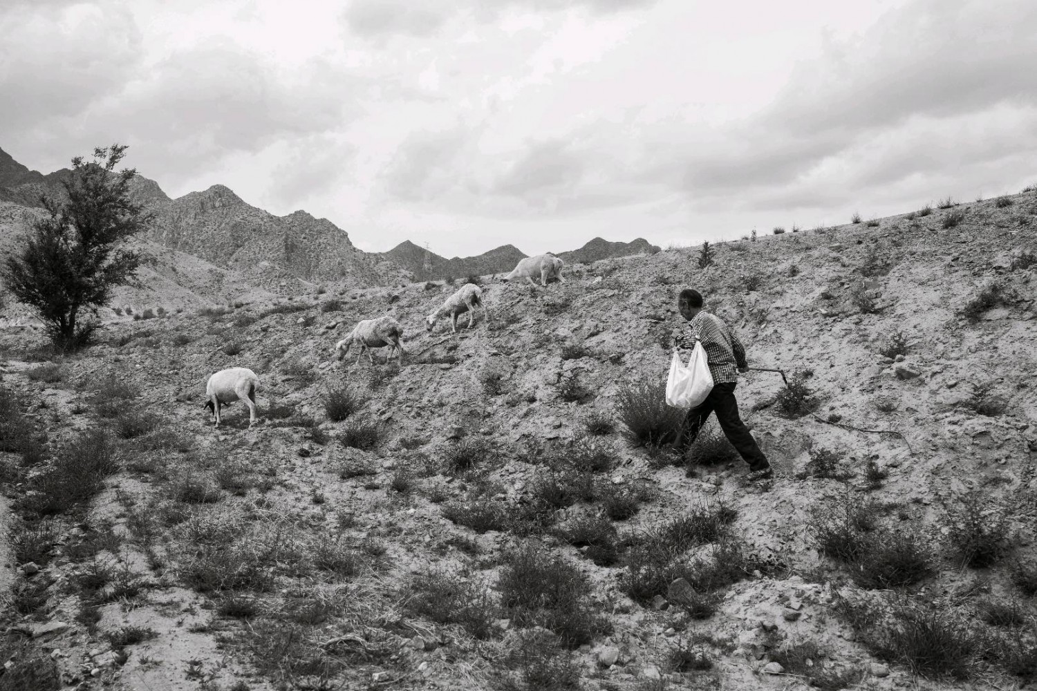 作品说明:这张照片是我在山西忻州市偏关县,沿着长城一号旅游公路一路进行田野调查时,在路边偶然看见的。一个年迈的羊倌驱赶着一群羊,在崎岖的山坡上面上上下下。羊倌的身上被太阳晒成泥土的颜色,手上拿着一个白色的布袋子,在白花花的羊群中各位显眼。
