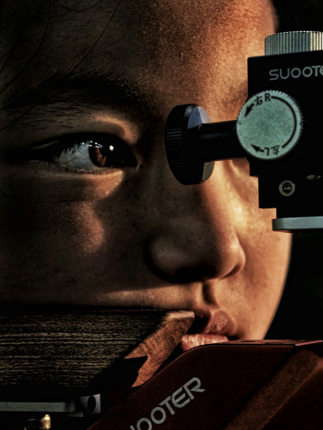 作品说明:特写镜头聚焦于运动员的眼部,眼中倒映着 专注与坚定。细腻的光影勾勒出运动员面部 轮廓,凸显其沉稳气质。也传达出在射击运 动中,专注所蕴含的强大力量,每一次瞄准 都是对自我和目标的深度探寻。