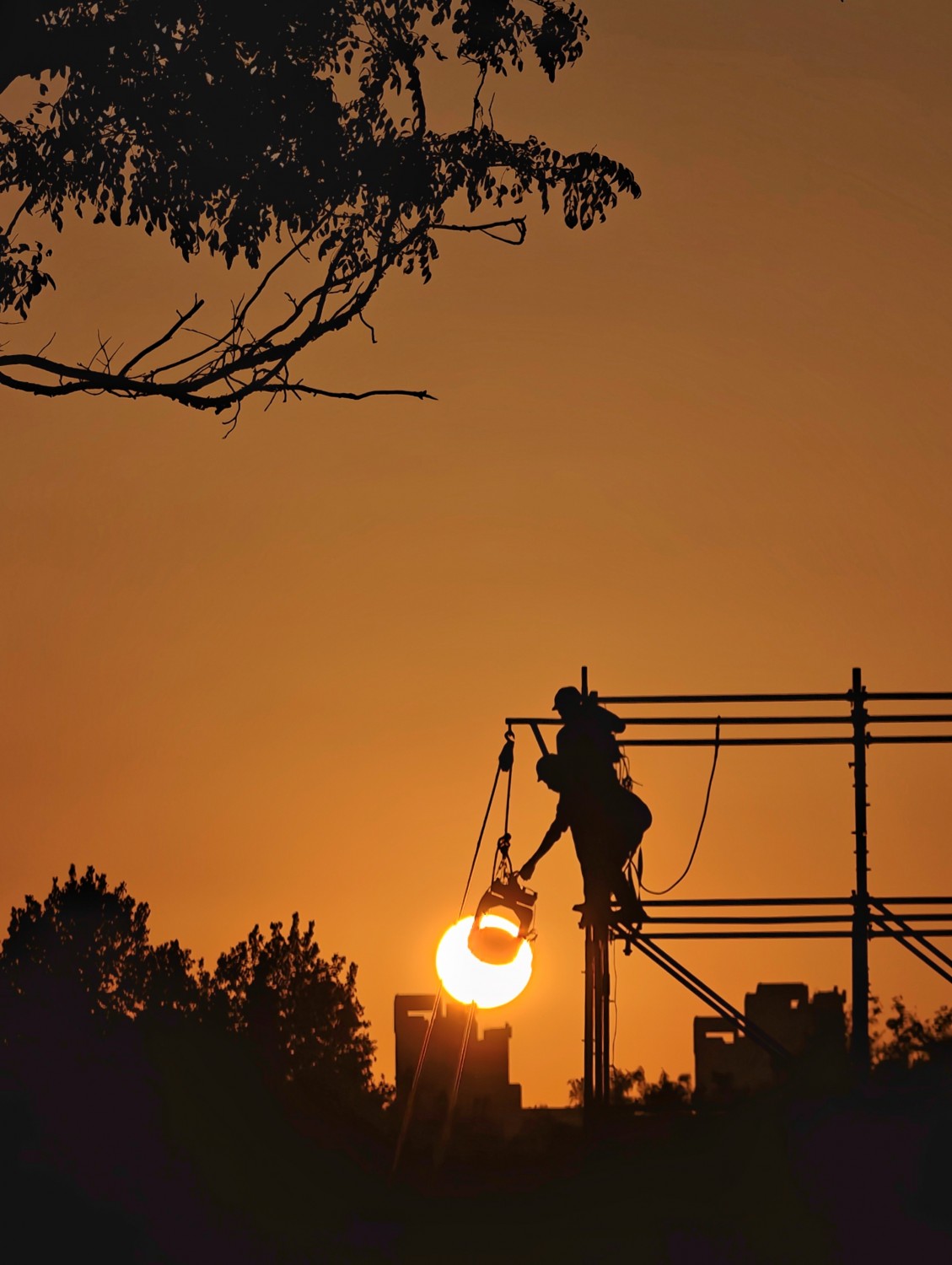 作品说明:夕阳把天空晕染成温柔的橘色,多少人沉醉于这幕自然的浪漫,举起镜头记录光影的诗行。而脚手架上的他们,与工具为伴,在黄昏的剪影里默默劳作。当我们为夕阳驻足时,是他们用汗水为城市的明天搭建骨架,他们才是这城市里最动人的“追光者”,在日落时分,书写着关于坚守与建设的故事。