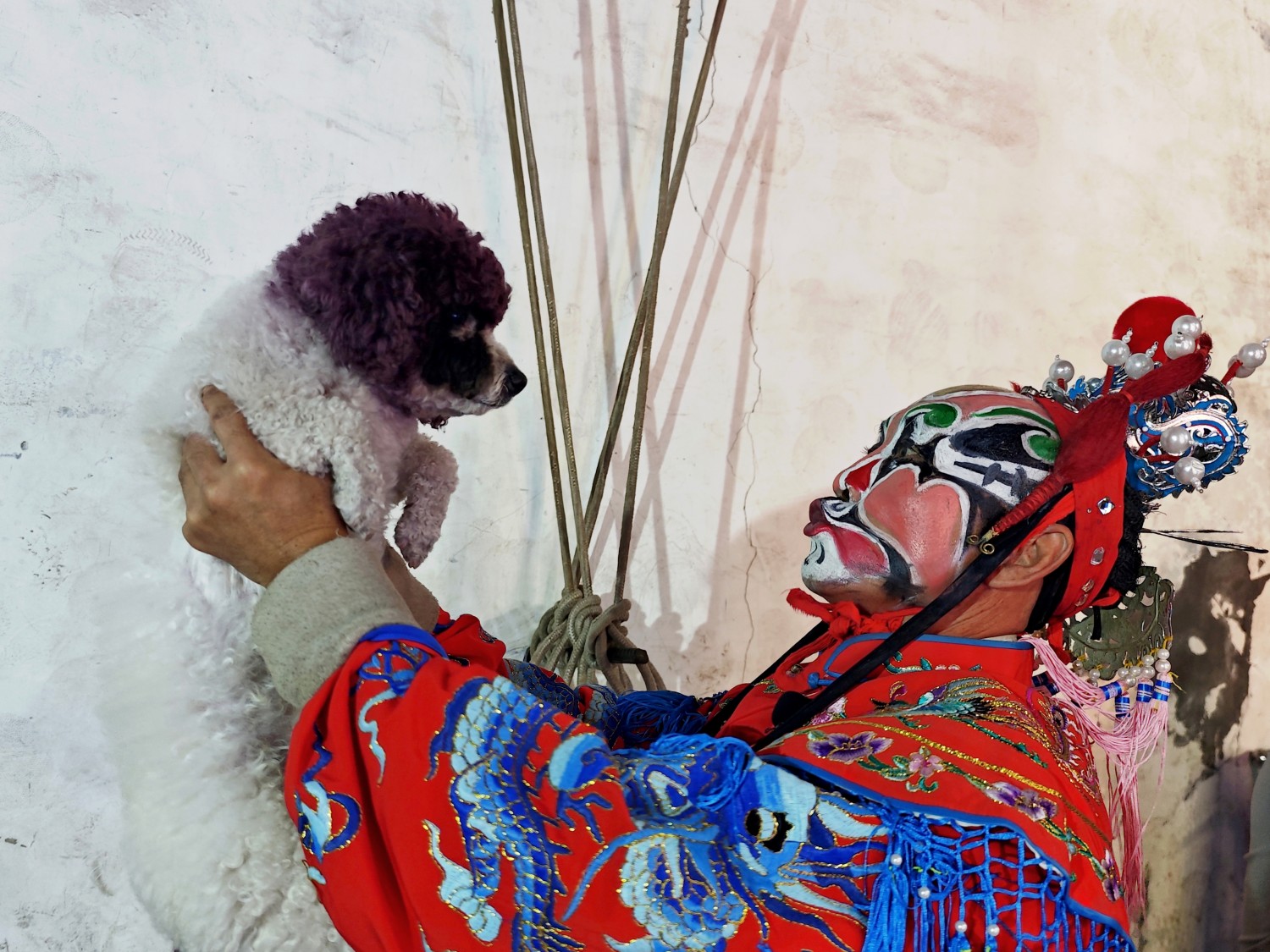 作品说明:照片拍摄于乡村戏曲后台花脸演员与宠物狗之间的亲昵场景,呈现出乡村戏曲后台既具专业特色又充满生活温度的独特画面。