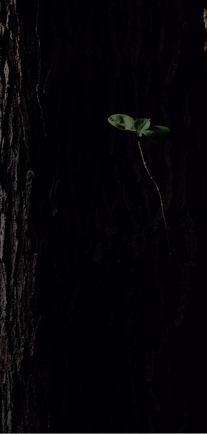 作品说明:这张图片展现了一株嫩绿的藤蔓植物,从深沉黝黑、纹理粗糙的树干中生长而出。深色的树干占据了画面的大部分,形成强烈的视觉对比,凸显出那抹绿色的鲜活与生机,仿佛在深沉的背景中绽放出生命的希望,传递出一种在沉寂中孕育新生、于黑暗里追寻光亮的意境。