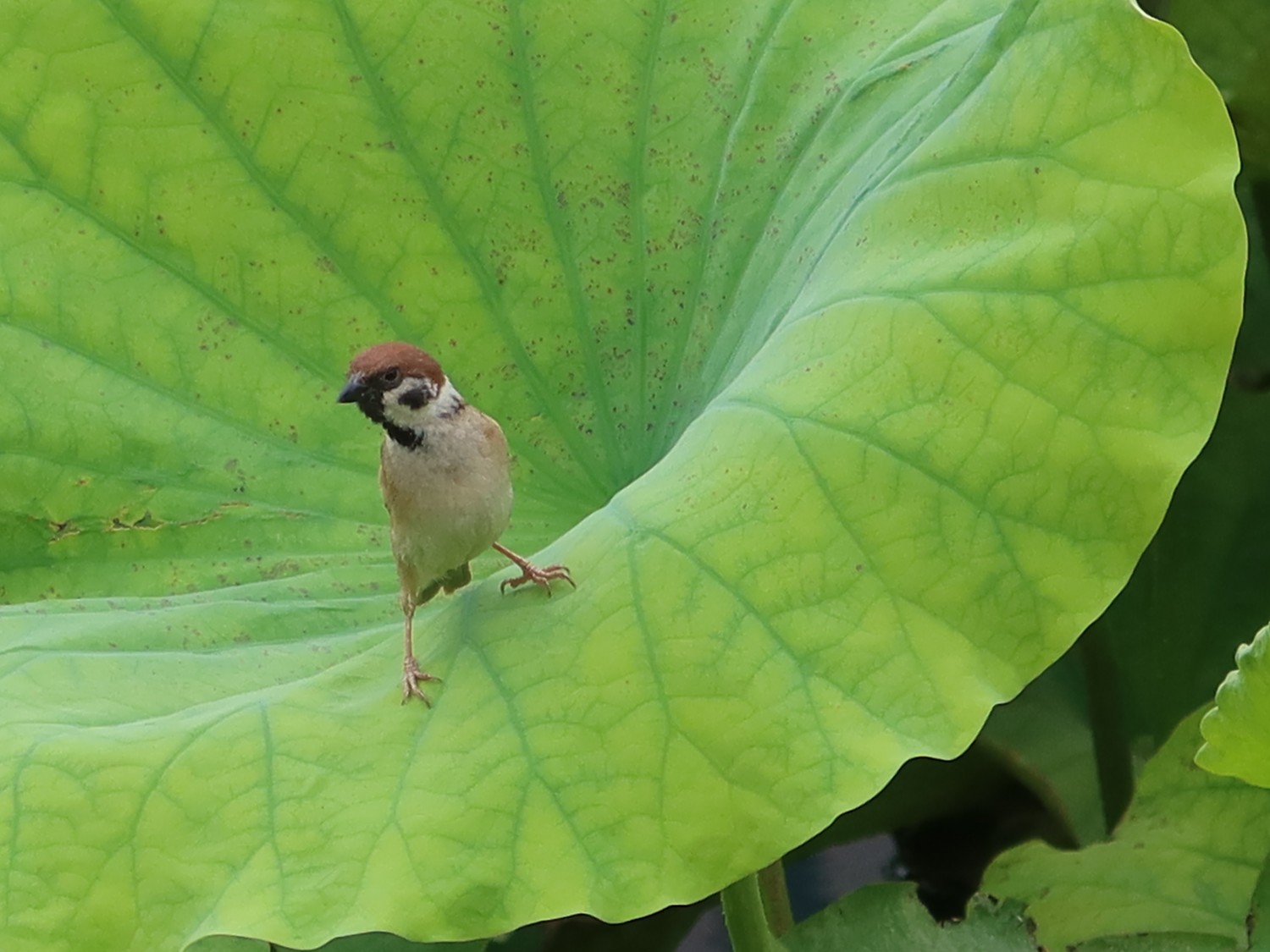 作品说明:荷塘内小麻雀以荷叶为舞台高声歌唱。