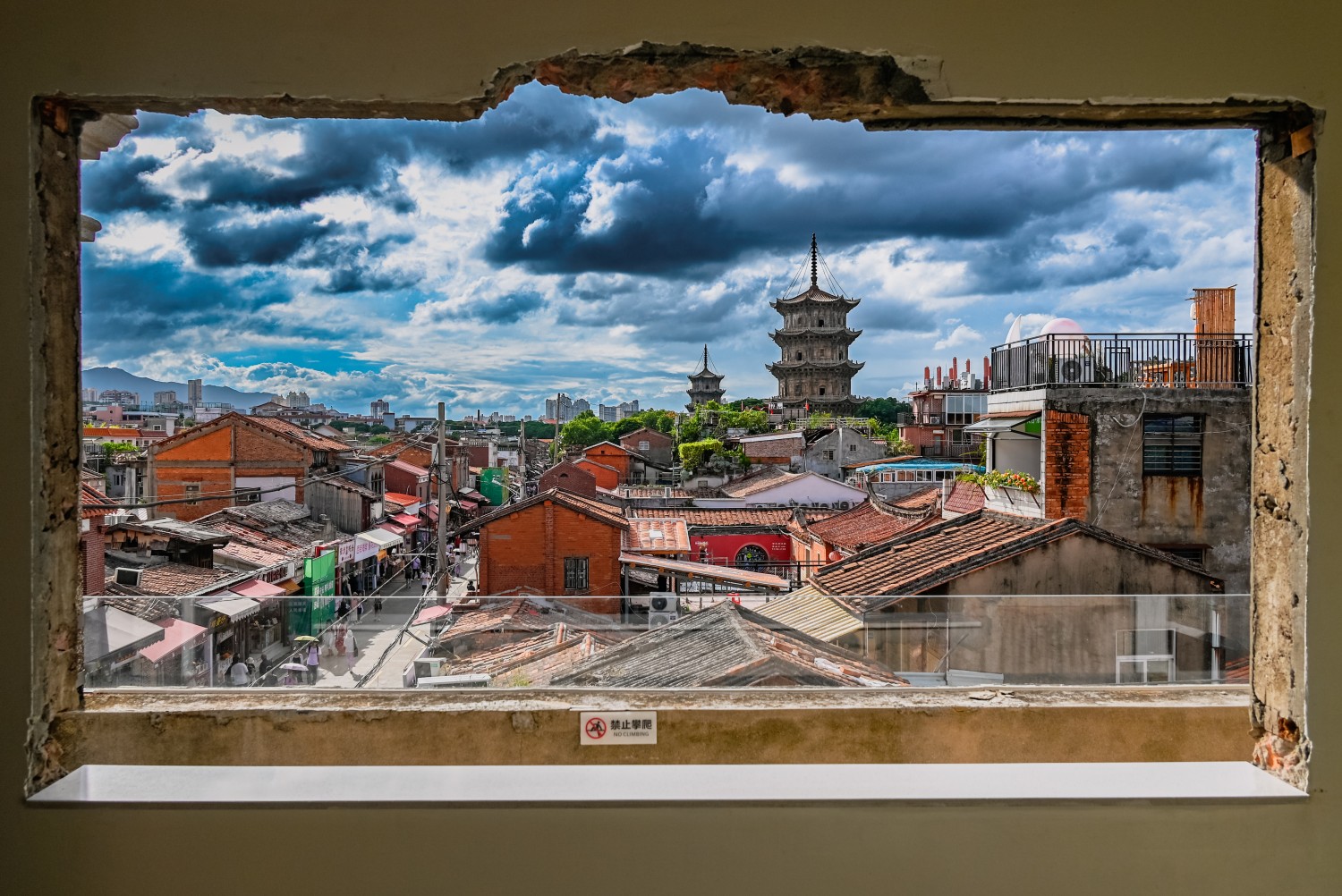 作品说明:从窗户望去,泉州世遗东西塔与古城映入眼帘