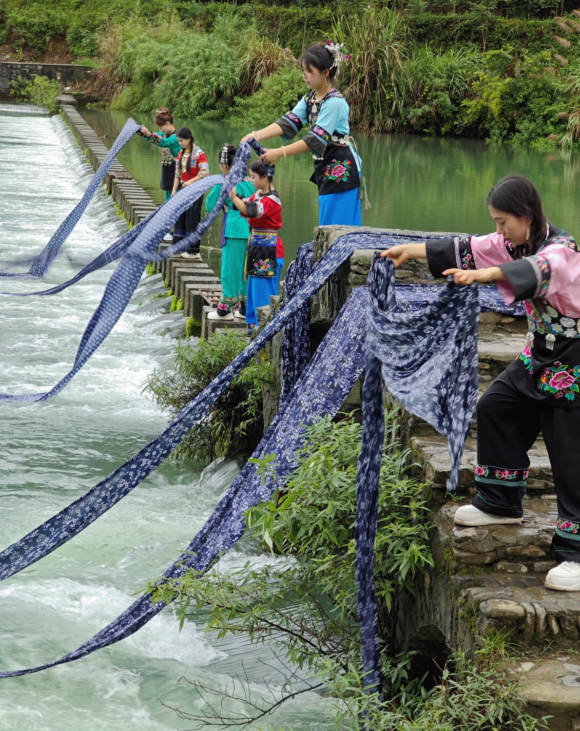 作品说明: 河边微风轻拂,几位苗家姑娘正忙着浣洗蓝花印染布。青蓝色的布料在清水中舒展、摆动,姑娘们手起手落间,将染布上的浮色细细漂洗,动作娴熟又专注。她们脸上满是活力,虽忙碌却不亦乐乎,这既是对非遗蓝染技艺的践行,也让静谧的河畔满是鲜活的生活气息。