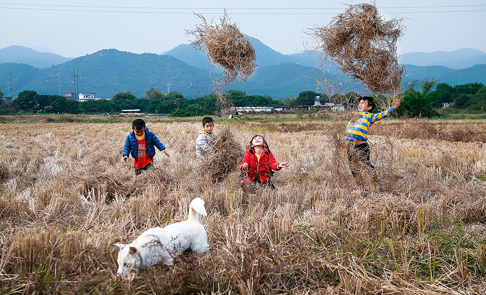 作品说明:孩子们在收割后的水稻田地里快乐玩耍。