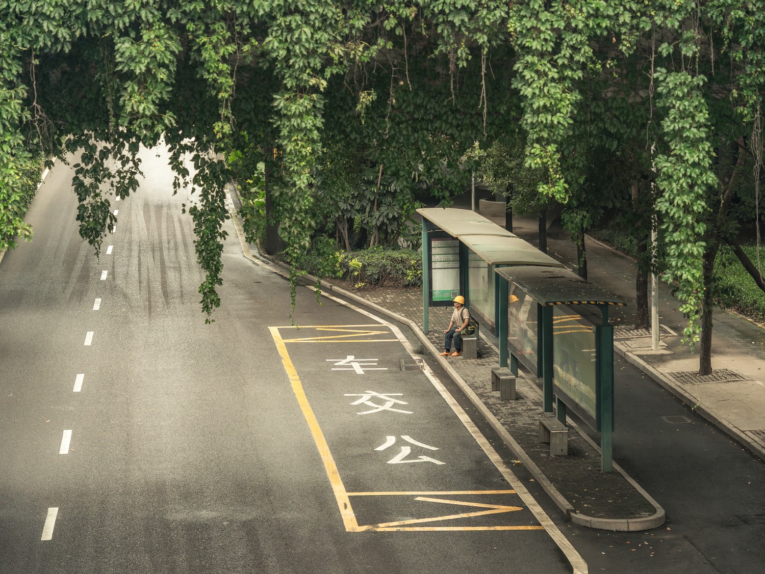 作品说明:藤蔓垂落如绿瀑,给公交站台围出一方幽凉的小世界。戴黄色安全帽的工人,结束了一天的劳作,安静坐在长椅上。路面上 “公交车” 的标识静静卧着,像在等一辆载他回往日常的车。没有惊心动魄的情节,只是千万个平凡日子里的缩影 —— 绿植在悄声生长,公交会按时抵达,人在等待中与这方小天地默默相依,生活的寻常暖意,就藏在这样的细节里。