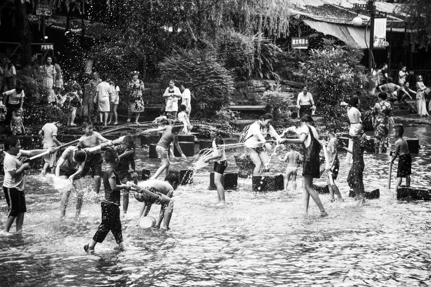 作品说明:定格众人在水中嬉戏的场景,黑白画面也难掩欢快氛围,尽显夏日玩水的愉悦。