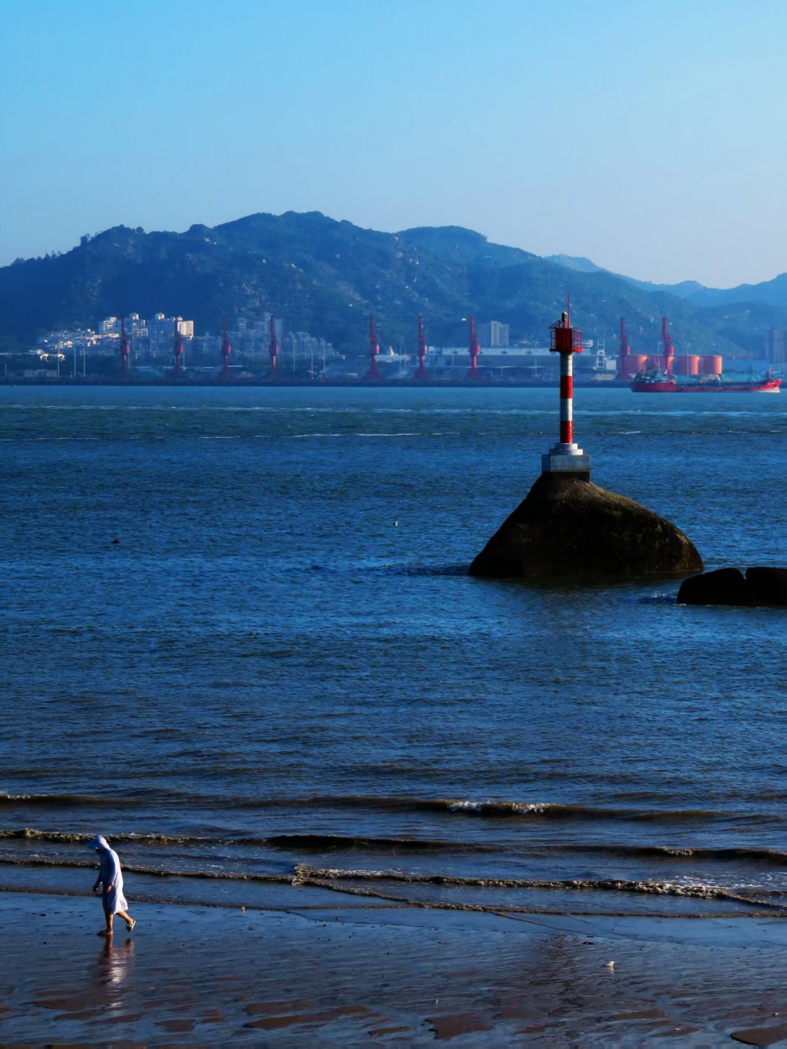 作品说明:这张照片定格了鼓浪屿的一隅静谧:澄澈的蓝海与柔缓的沙滩铺展开开阔的底色,远处的灯塔静静伫立,如同一枚定海神针,为这片海锚定了方向与诗意。沙滩上,行人化作渺小的剪影,在光影里缓缓行走,既添了人间烟火气,更衬得海天辽阔。整体画面蓝得纯粹、静得治愈,仿佛能让人听见海浪轻拍沙滩的声音,感受到鼓浪屿独有的慢时光。
