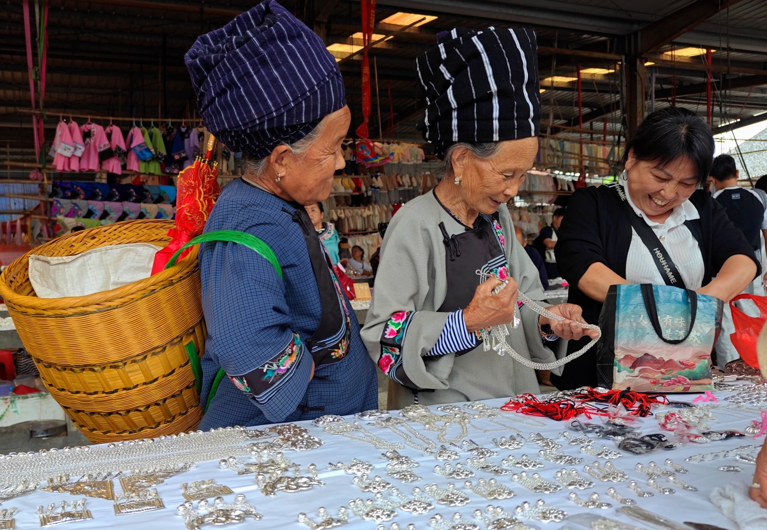作品说明:凤凰集市的烟火气中,两位背着竹背篓的老人驻足银饰摊位前,指尖轻触亮泽的银饰,似在细细挑选合心意的物件。背篓里或许装着刚购置的山货,此刻却暂被放下,让位给这份对精致银饰的偏爱。古老集市的韵味与老人从容的身影相融,银饰的微光里,藏着属于他们的岁月静好与对生活的细碎热爱。