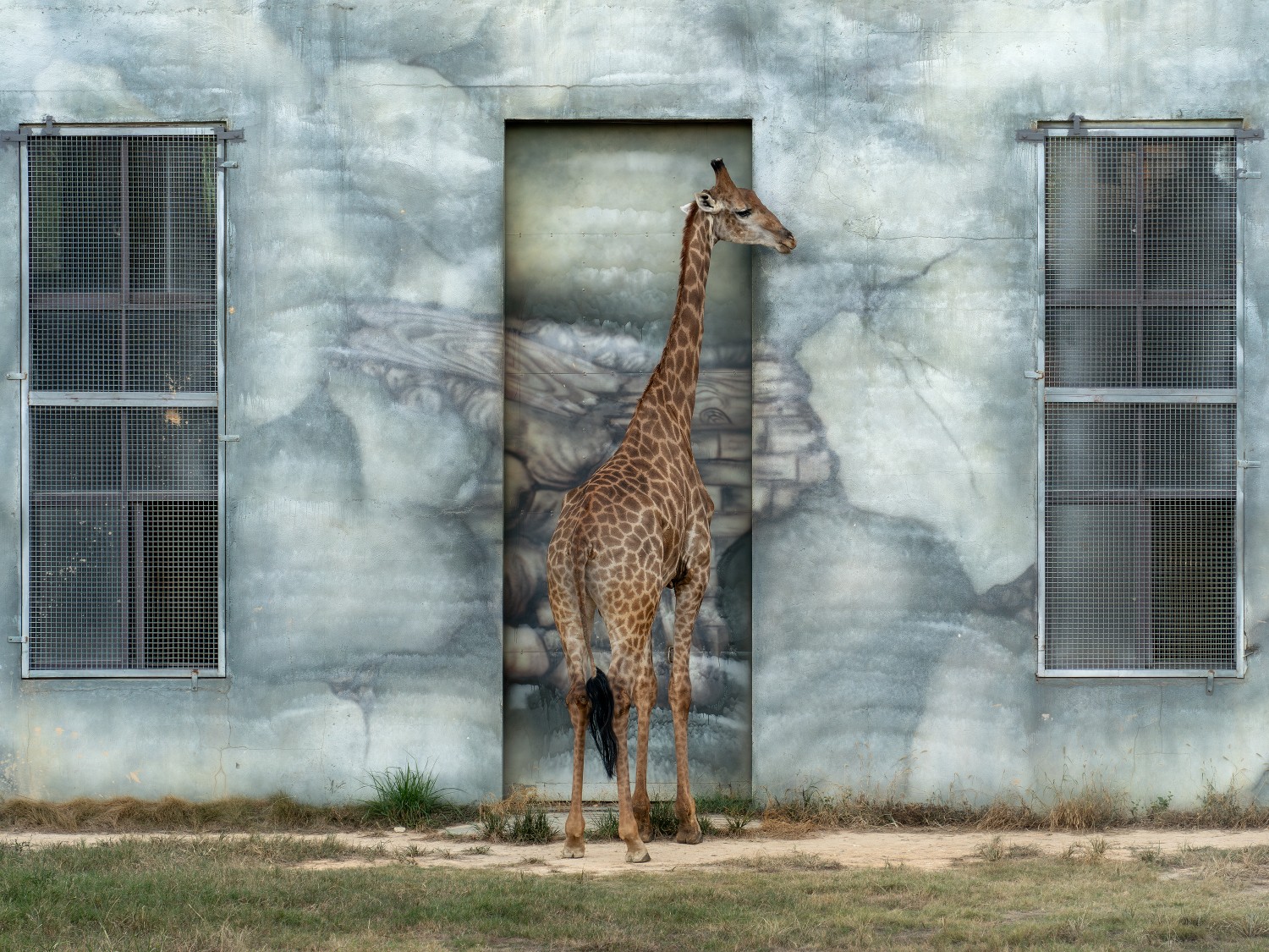 作品说明:它立于人工摹画的 “荒野” 前,斑纹在水泥墙的灰调里倔强生长。 那扇门后是画出来的山石,两侧铁窗把天空切成方格 —— 它的视野,一半是被精心营造的 “自然”,一半是无可回避的囚笼。 我们总在努力复刻野的模样,却忘了真正的自由从不是墙面上的涂鸦。当长颈鹿的目光越过这方天地,它看见的是画外的真实,还是更辽阔的禁锢? 或许,每个试图圈养 “自然” 的地方,都在照见人类对自由的永恒困惑。