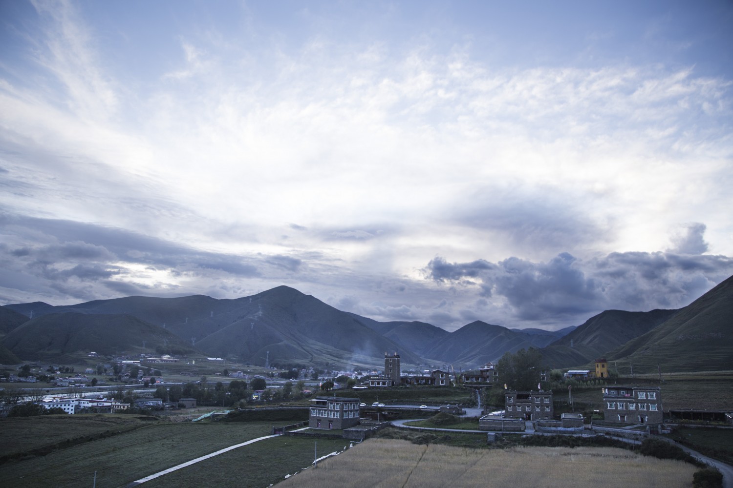 作品说明:展现出独特的乡村傍晚景致。画面里,云层厚重且形态多变,在天空中铺展,与渐暗的天色交融,营造出静谧又略带朦胧的氛围。远处连绵的山脉轮廓清晰,似沉默的守护者,增添了画面的厚重感。山脚下,乡村建筑错落分布,或高或低,带着质朴的气息,与周围的田野、道路共同构成和谐的乡村图景。整体场景传递出一种远离喧嚣的宁静,仿佛能让人感受到山乡傍晚时分,时光缓缓流淌的悠然,也体现出自然与乡村人文相融的美好意境,给观者带来心灵的沉静与对田园生活的向往。
