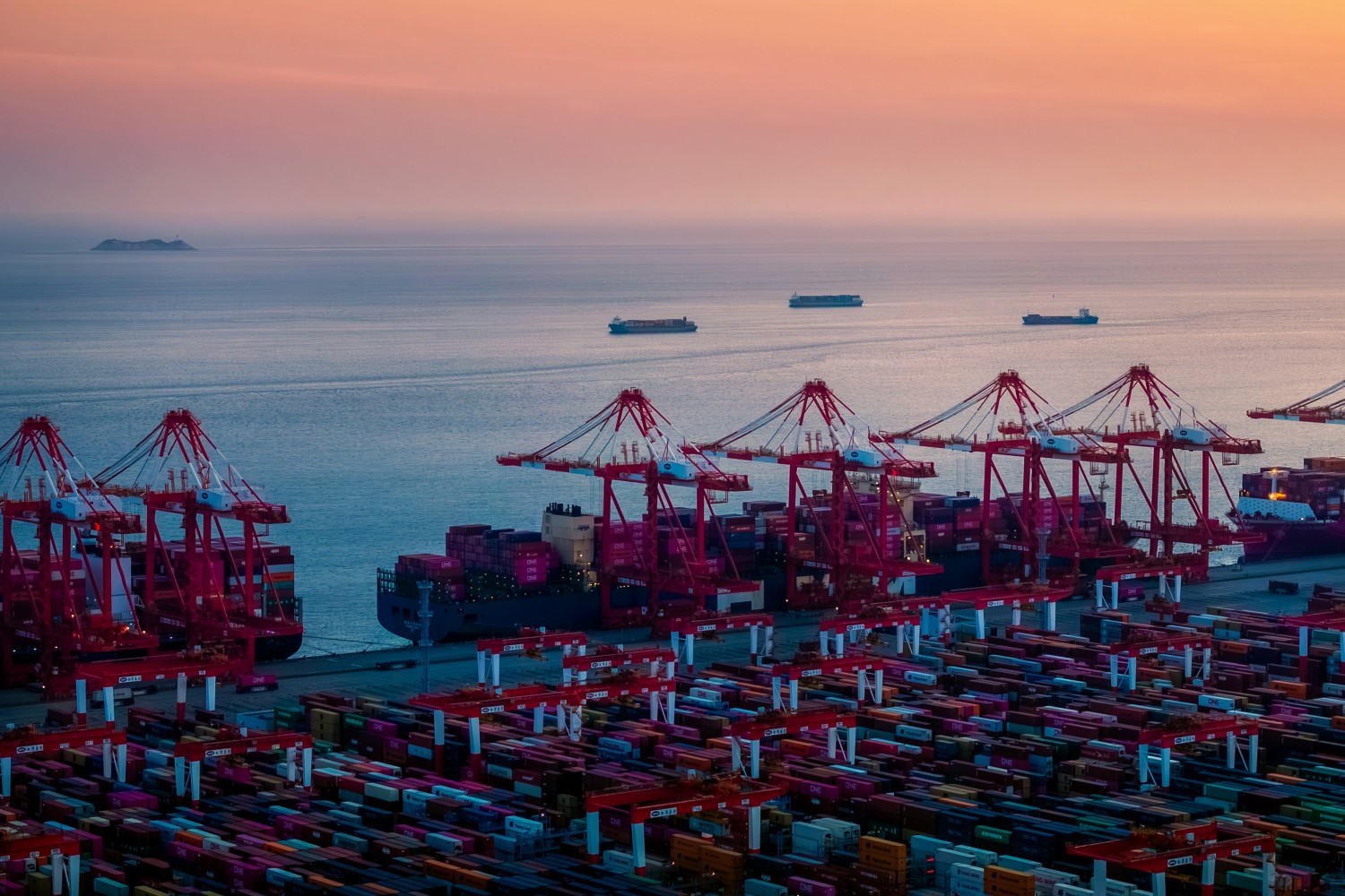 作品说明:洋山港位于浙江省嵊泗县境内;由大洋山港口区和小洋山港口区组成;是上海国际航运中心的深水港区;傍晚的洋山港晚霞美丽动人。