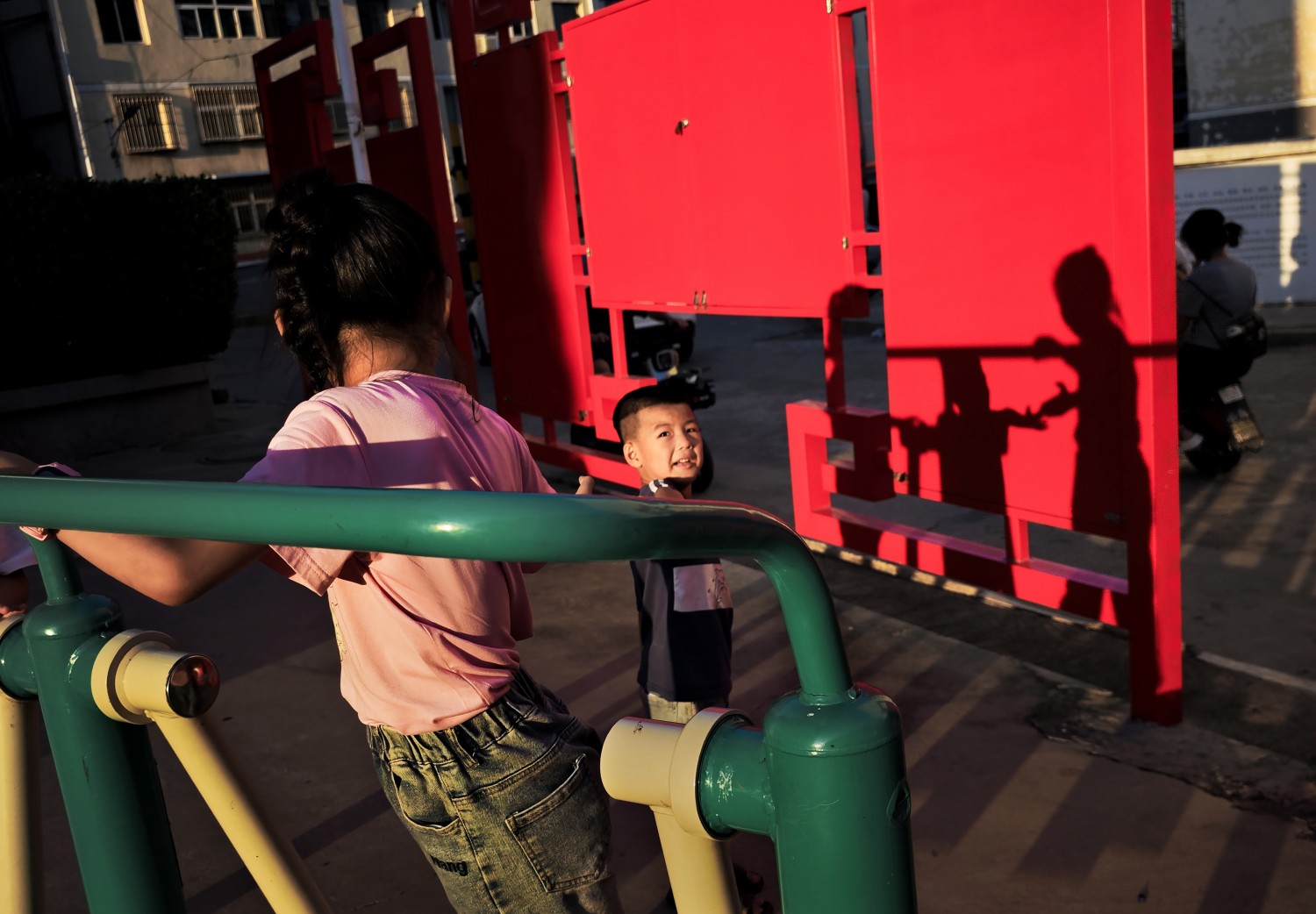 作品说明:夕阳下孩子们在小区的健身器材旁玩耍。