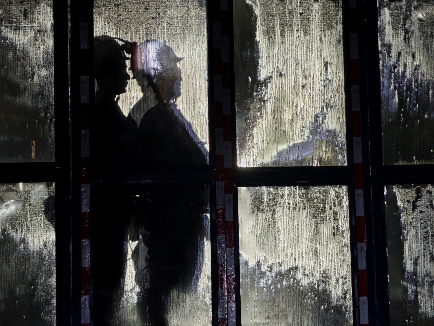 作品说明:两个矿工的身影在昏暗的矿洞灯光下,投射出清晰的剪影。他们头戴安全帽,坚毅的轮廓在粗糙背景下格外鲜明。光影交错间,展现出煤矿工人在艰苦环境中默默坚守与奉献的形象,传递出一种深沉而厚重的