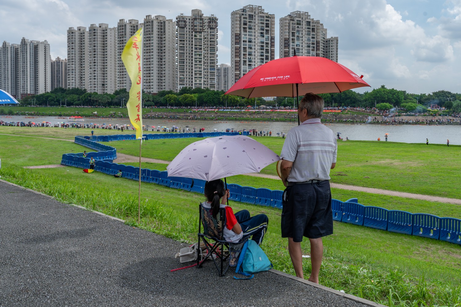 作品说明:2025环两江先行区,广东佛山南庄镇第三届“车水马龙”节制第十六届无人龙舟赛。现场的爷孙俩正打着伞观看龙舟比赛