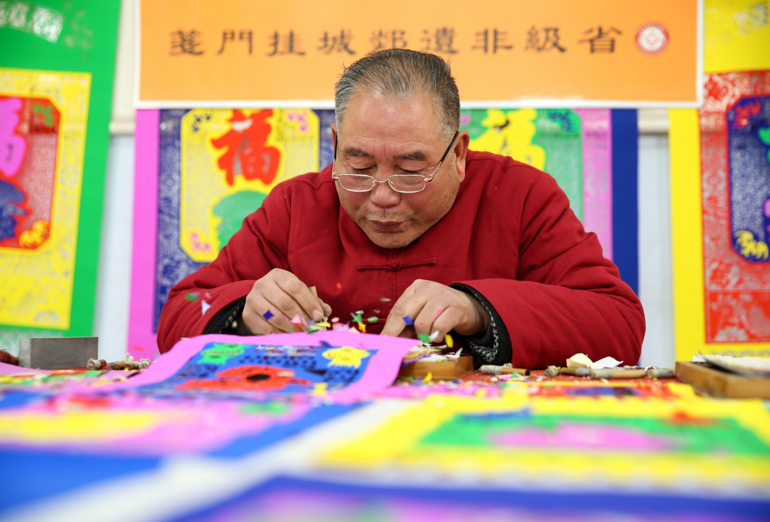 作品说明:2025年1月10日,山东省临沂市郯城县非物质文化遗产郯城挂门笺代表性传承人张乃苍在制作“五彩门笺”迎新年。