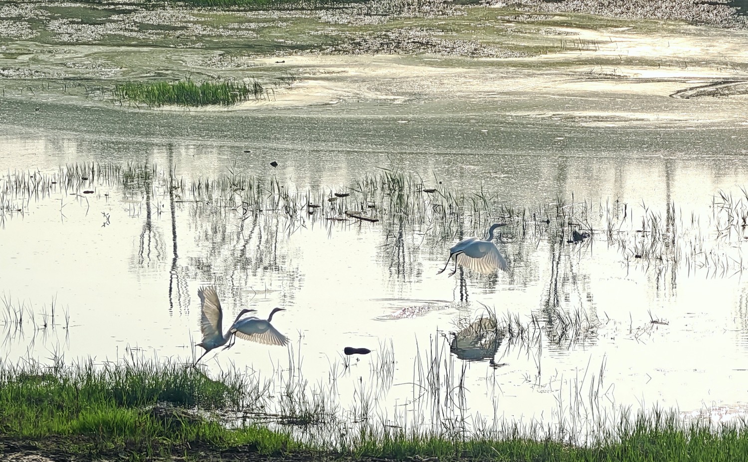 作品说明:手机抓拍到三只展翅欲飞的白鹭,它们洁白的身影与湿地的绿意、水的澄澈相映成趣,构成了一幅充满生机与自然之美的灵动画面,尽显湿地生态的和谐与雅致。