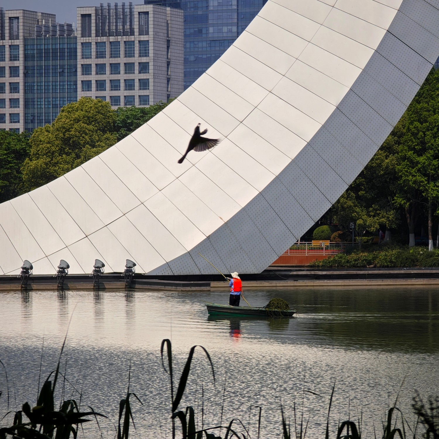 作品说明:清理湖面的小船上的垃圾已经满满。洁净的生态湿地,衔着食物的小鸟飞驰归巢,绿色生态营造人和动物美好的共同家园。摄自常州地标性建筑:金戒指。