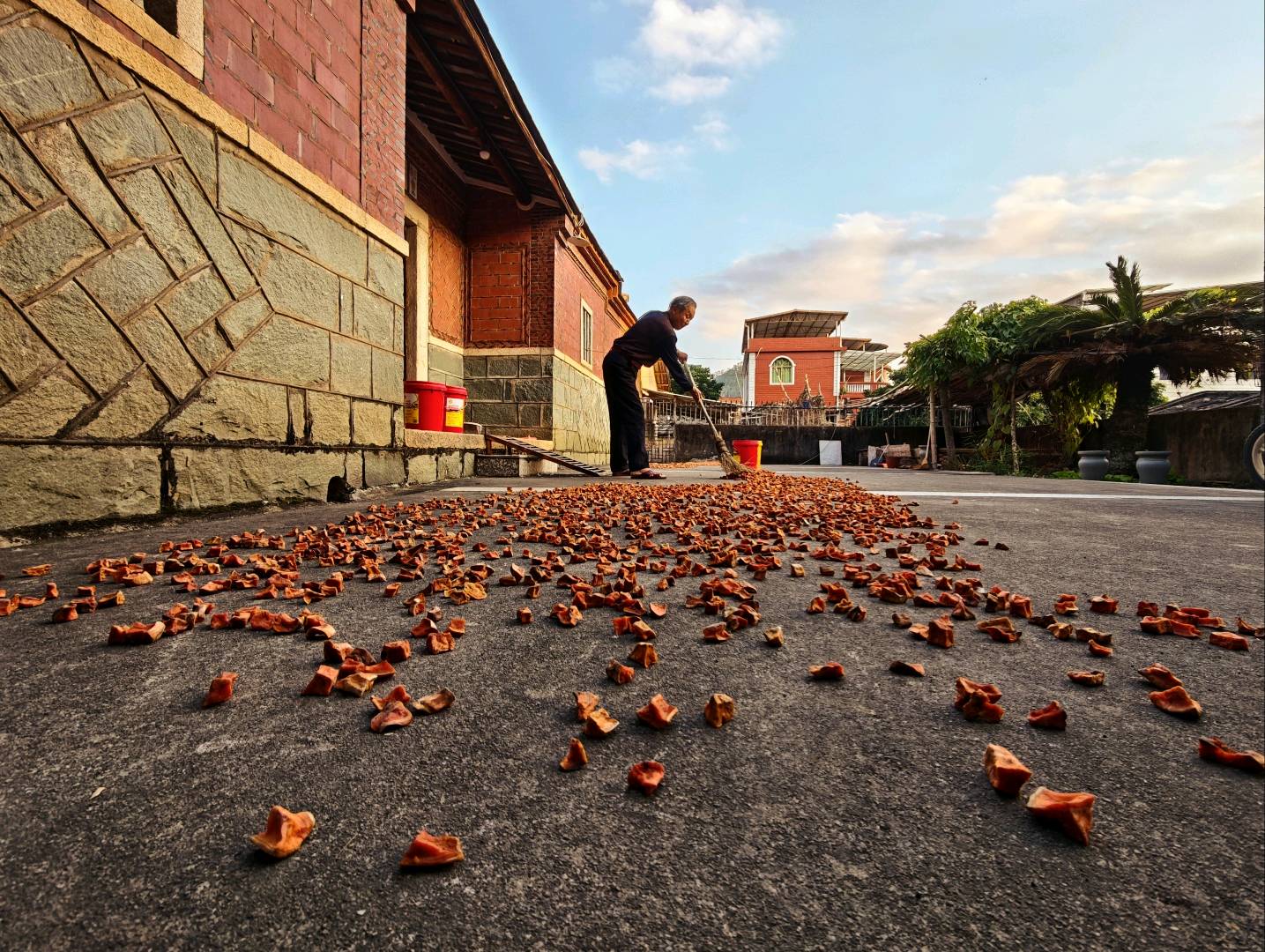 作品说明:爷爷在老院子里扫着丰收的地瓜干