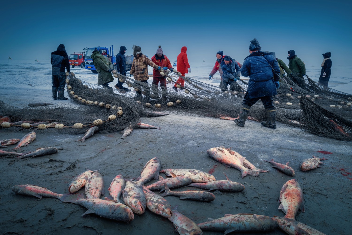 作品说明:查干湖冬捕是吉林省松原市一种传统的渔业生产方式。数九寒天,冰雪天地,大烟炮漫天席卷,近千人冰上作业,几十辆机动车昼夜运输,每天数万斤鲜鱼脱冰而出,最多的一网拉出了21万公斤的肥硕大鱼,创造了吉尼斯世界纪录,其规模之大,堪称全国之最;产量之多,堪称世界奇观。